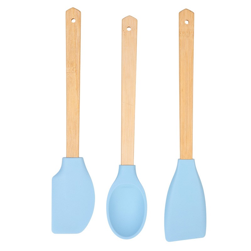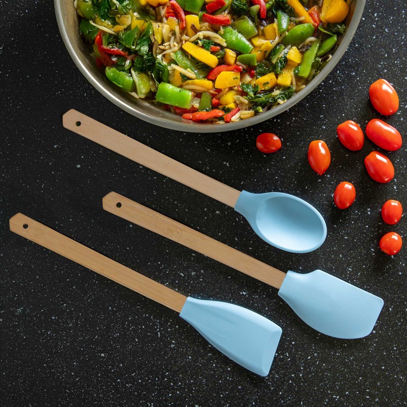 Háromdarabos szilikon konyhai eszközkészlet - lapát, spatula és kanál. Rugalmas szilikonfejeik nem karcolják a felületeket, a fanyelek akasztónyílása pedig megkönnyíti tárolásukat. Ideális keveréshez, kanalazáshoz és simításhoz. Szilikon, fa. 32 x 2 cm