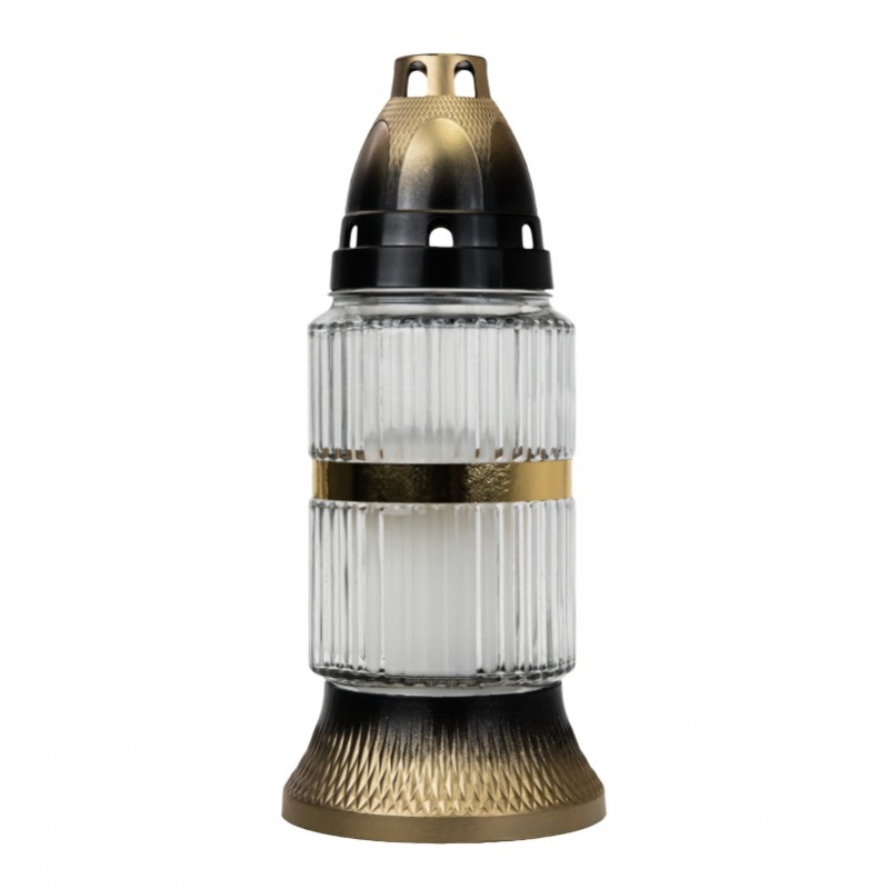 Az üvegmécses a klasszikus elegancia és a praktikum ötvözete. Stílusos, bordázott üveg, díszes aranyszalag, valamint fekete és arany árnyalatú masszív talp - elegáns, méltóságteljes design, amely kiemeli a pillanat ünnepélyes jellegét.