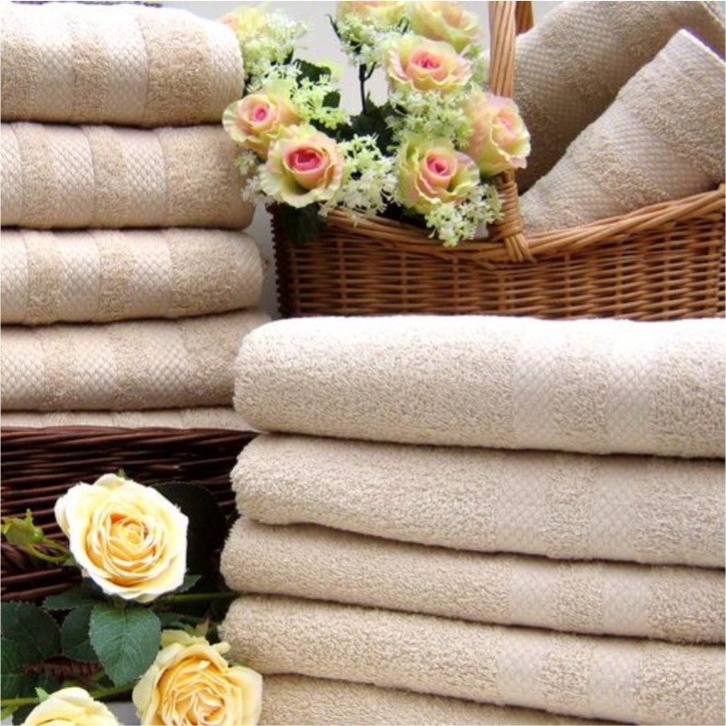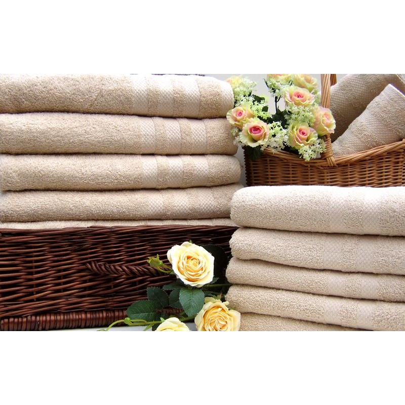 A 70 x 140 cm-es, bézs törölköző a természetes pamutfrottír anyagból készült elegáns kivitelben.