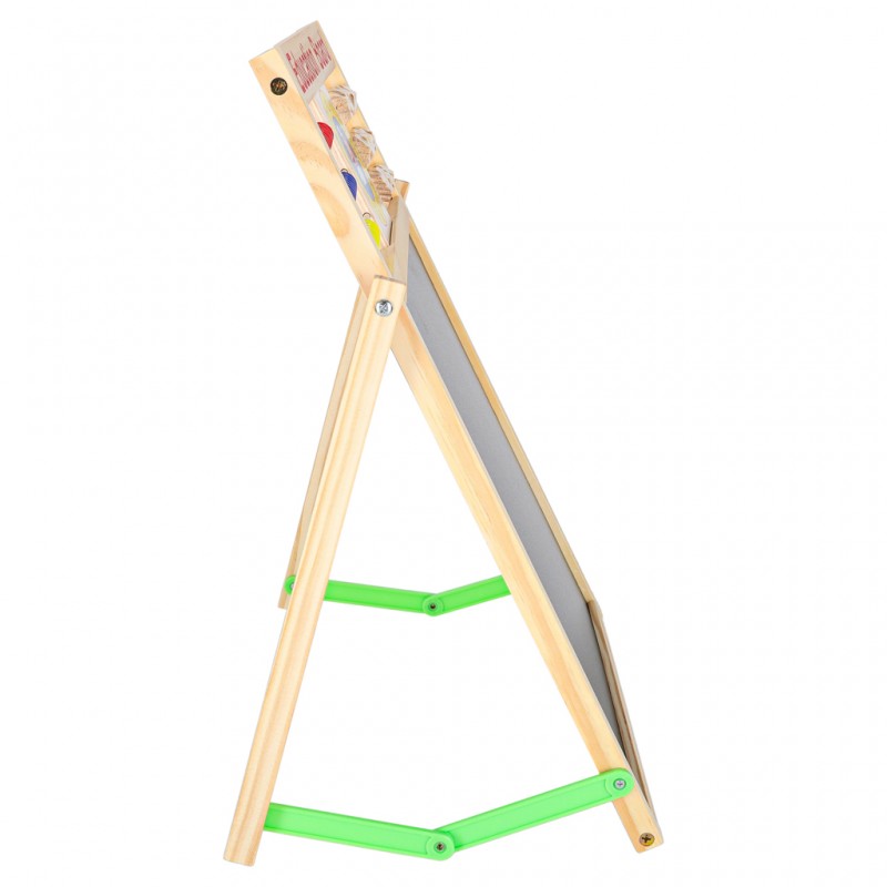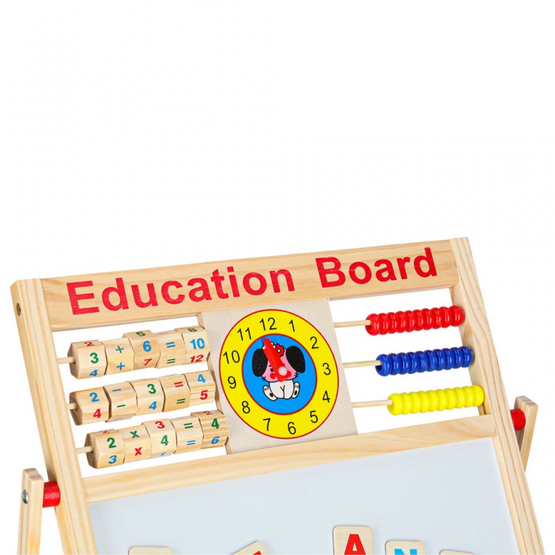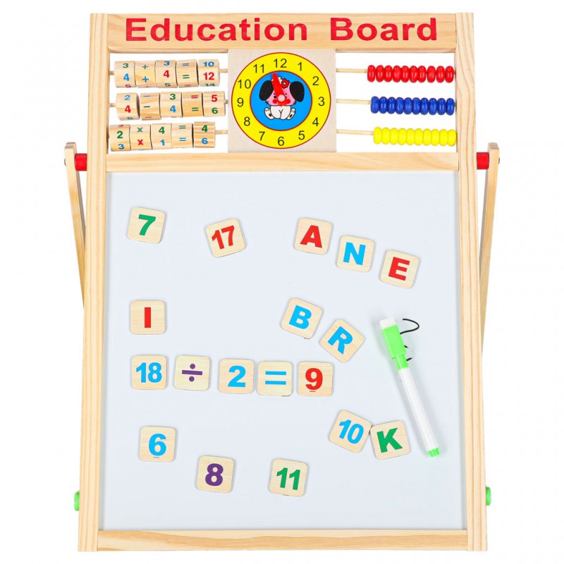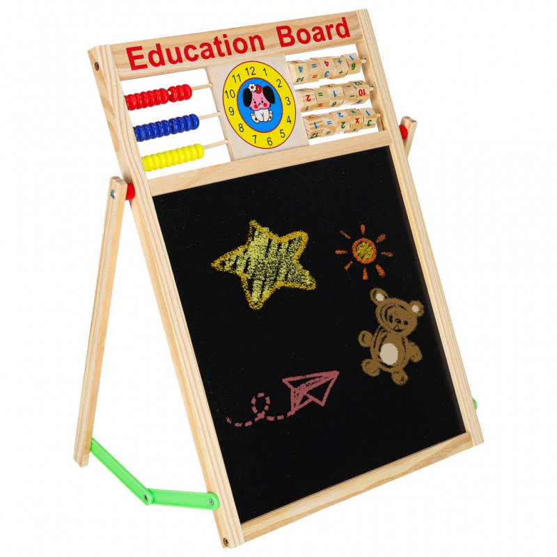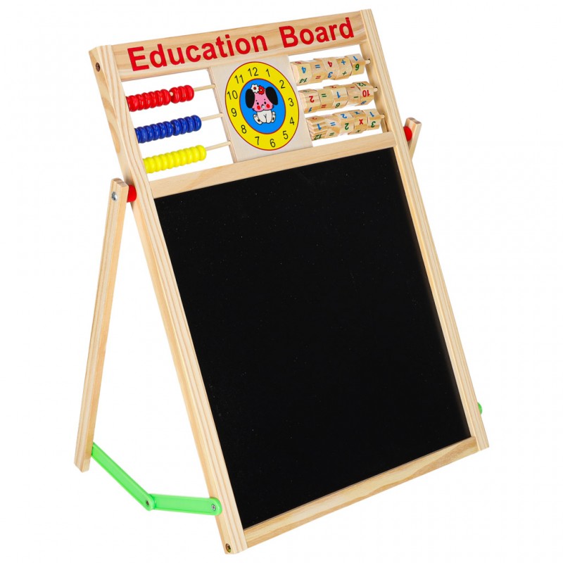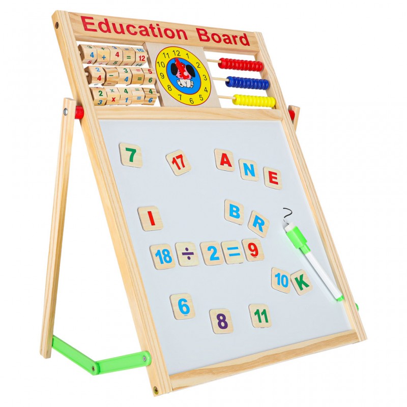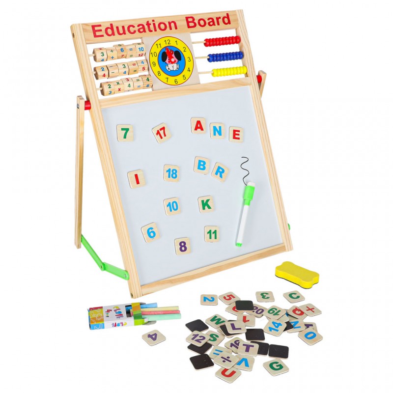 Kétoldalas, fából készült gyerektábla krétás és mágneses oldallal, számolóval, órával, betű- és számmágnesekkel, krétákkal, filccel és szivaccsal - játékos, oktató eszköz a betűk, számok és az óra tanulásához.