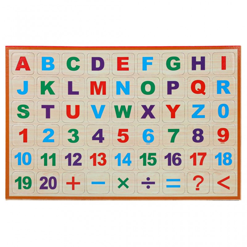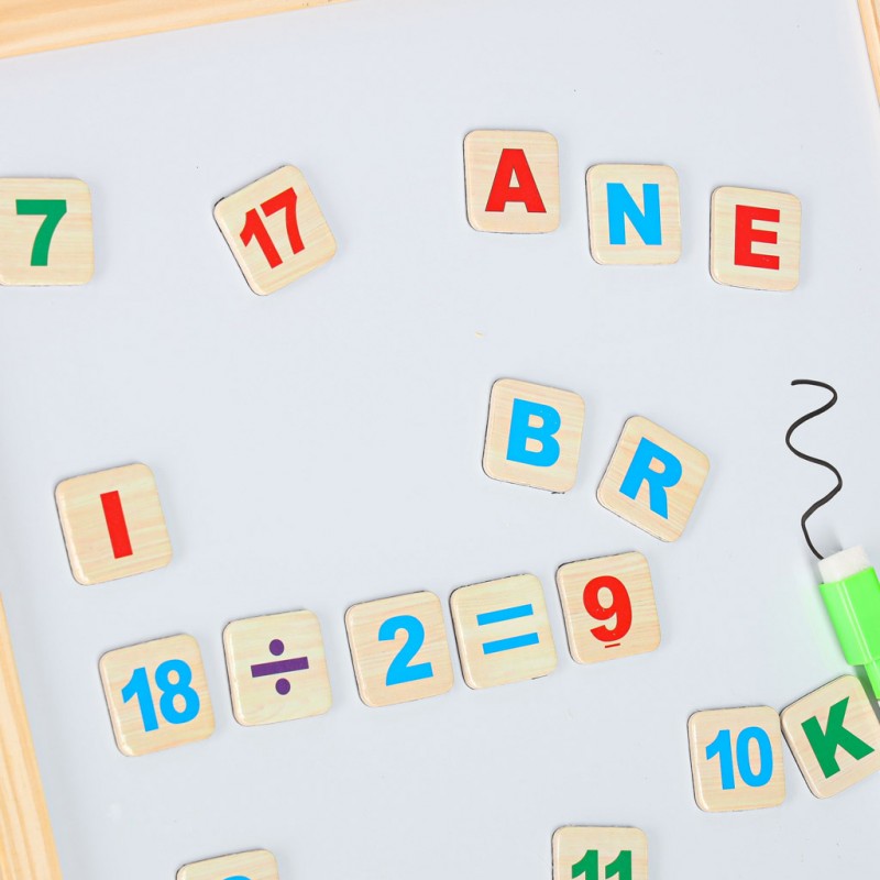 A tábla stabil váza teljes egészében fából készült, ami biztos tartást ad játék közben. A tábla kétoldalas: az egyik oldalon fekete felület található krétás íráshoz, a másik oldalon fehér felület filces íráshoz és mágnesekhez. A szett tartalmazza a táblát, 54 darab betű- és számmágnest, 4 különböző színű krétát, filctollat a táblára való íráshoz, valamint szivacsot a törléshez, így komplett gyakorló készletet kapunk.
