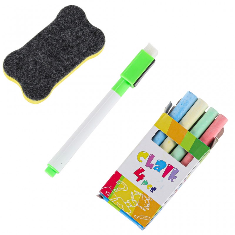 Kérdés: Mit tartalmaz a készlet? Válasz: A készlet része a tábla, 54 darab betű- és számmágnes, 4 különböző színű kréta, egy filctoll a táblára való íráshoz és egy szivacs a törléshez.