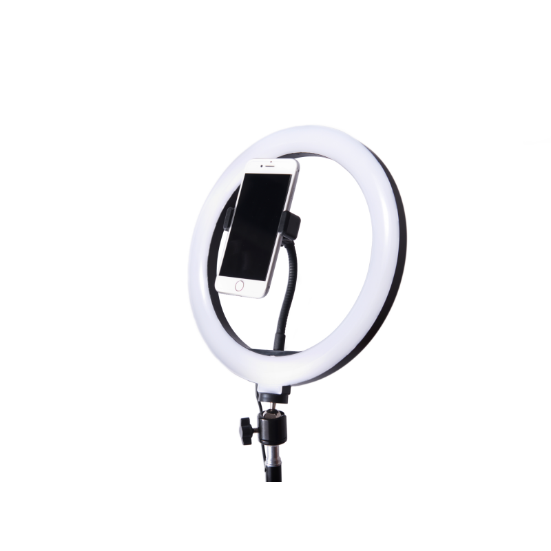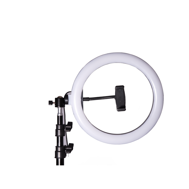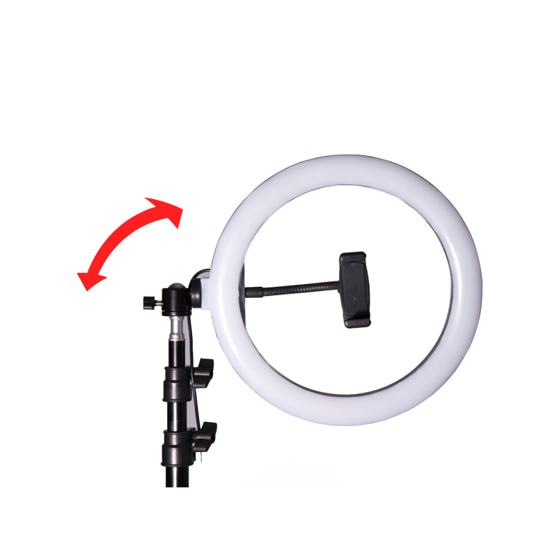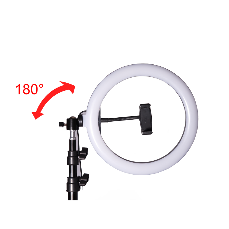 A gyűrűs forma kifejezetten az arc és a kisebb tárgyak egyenletes megvilágítására szolgál. A három fénySzín üzemmód - meleg (kb. 3000K), természetes (kb. 4000K) és hideg (kb. 5800K) - segít a megfelelő hangulat kialakításában sminkeléshez, portréfotókhoz vagy termékfotózáshoz. Az állítható állvány és a forgatható fej megkönnyíti a fény irányának és magasságának testre szabását, míg a telefontartó támogatja az okostelefonos videók és selfie-k készítését.
