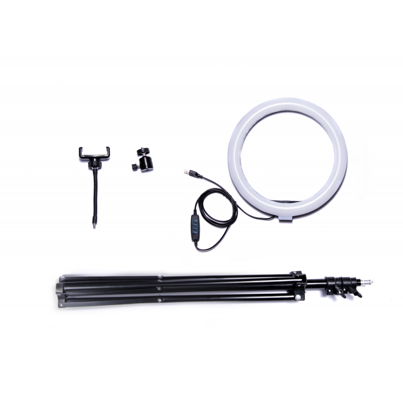A lámpa LED fényforrást használ 60 W teljesítménnyel. Forgatható fejjel és állítható magasságú állvánnyal rendelkezik, amelyek lehetővé teszik a fény irányának és magasságának rugalmas beállítását. A készlet része a hajlékony, forgatható telefontartó is, amely megkönnyíti az okostelefon különböző szögekben történő beállítását. A lámpa USB kábellel működik, így csatlakoztatható power bankhez, laptophoz vagy hálózati adapterhez. A fényerő és a színhőmérséklet szabályozása a kábelen elhelyezett távirányítóval történik, a termék leírásában szereplő adatok alapján.