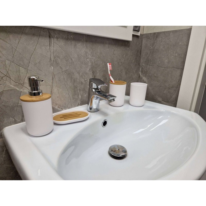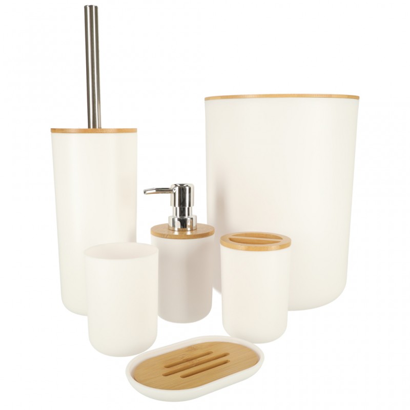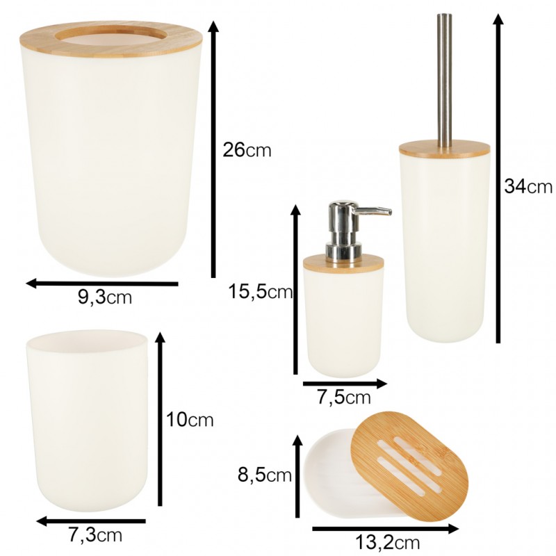 Biztosítsa fürdőszobájának egységes megjelenését és funkcionalitását. Ez az elegáns kiegészítő szett minimalista dizájnt ötvöz praktikus megoldásokkal - a tárolóedényektől és szappantartóktól a szemetesig. A fa díszítések természetes karaktert és melegséget kölcsönöznek minden belső térnek.