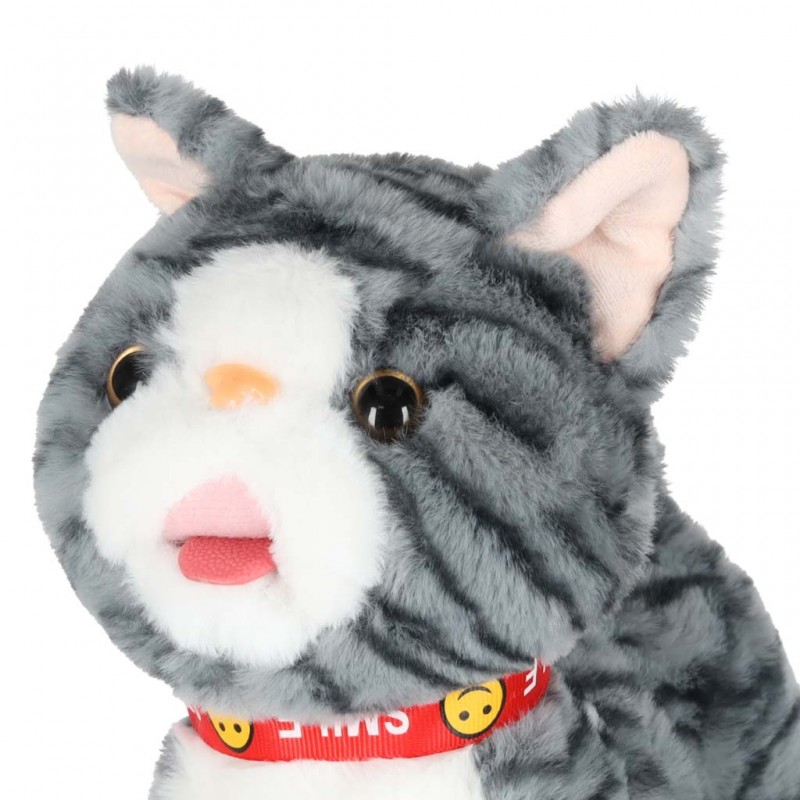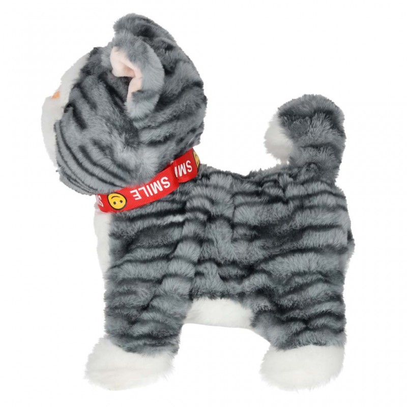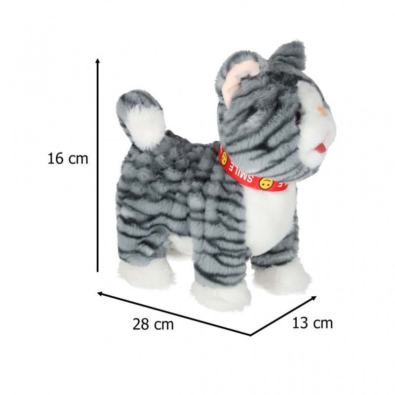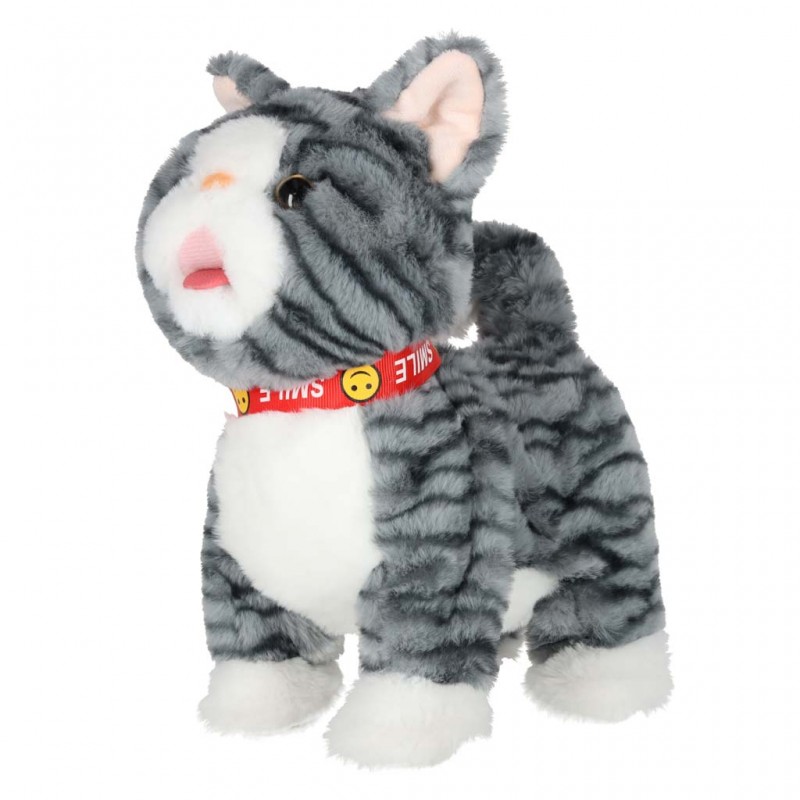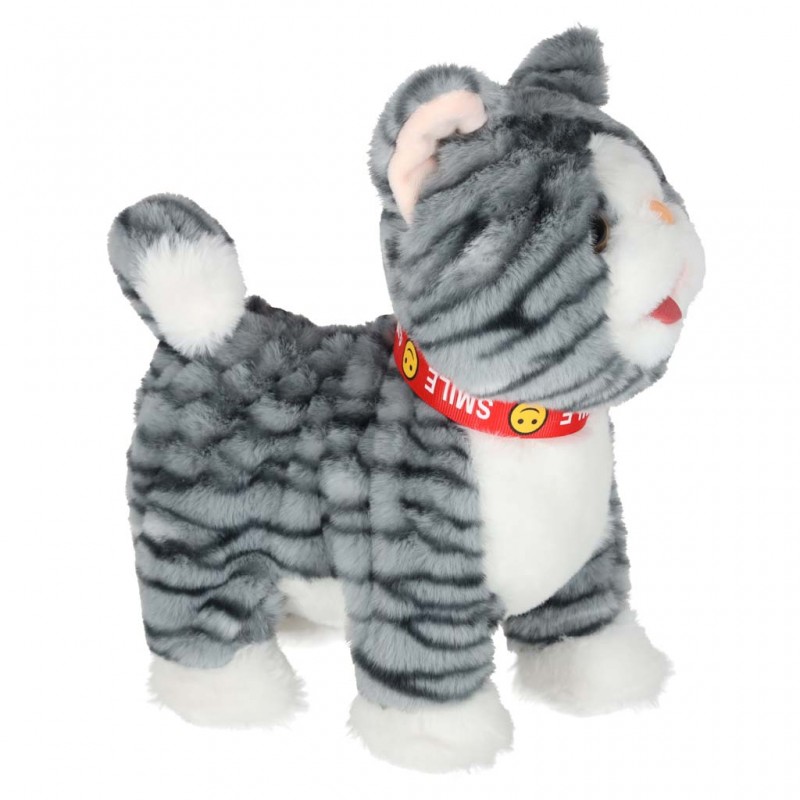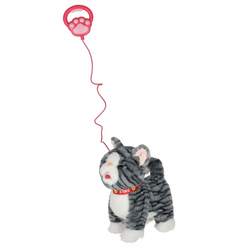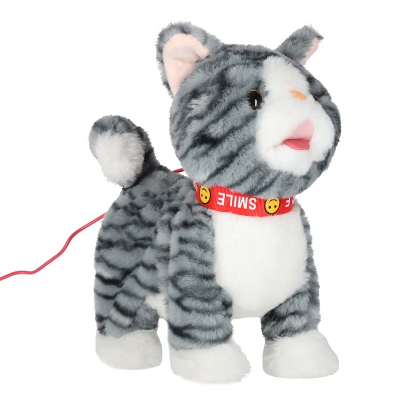 Interaktív plüss cica pórázon, 3 éves kortól ajánlott – szürke csíkos cica, amely előre sétál, nyávog, mozgatja a farkát és a nyelvét, valamint vidám angol dalokat játszik.