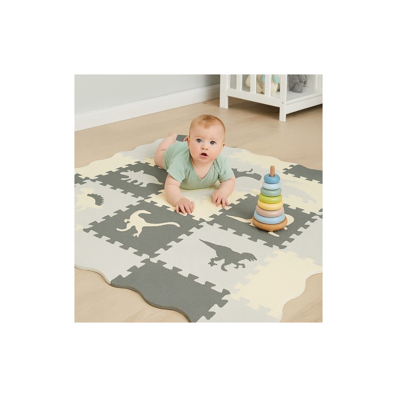 Dinoszaurusz mintás, habszivacs puzzle játszószőnyeg, amely biztonságos, puha teret ad játékhoz és tanuláshoz. A vastag elemek csillapítják az eséseket, szigetelnek a hideg padlótól, a vízálló felület pedig egyszerűen letörölhető.