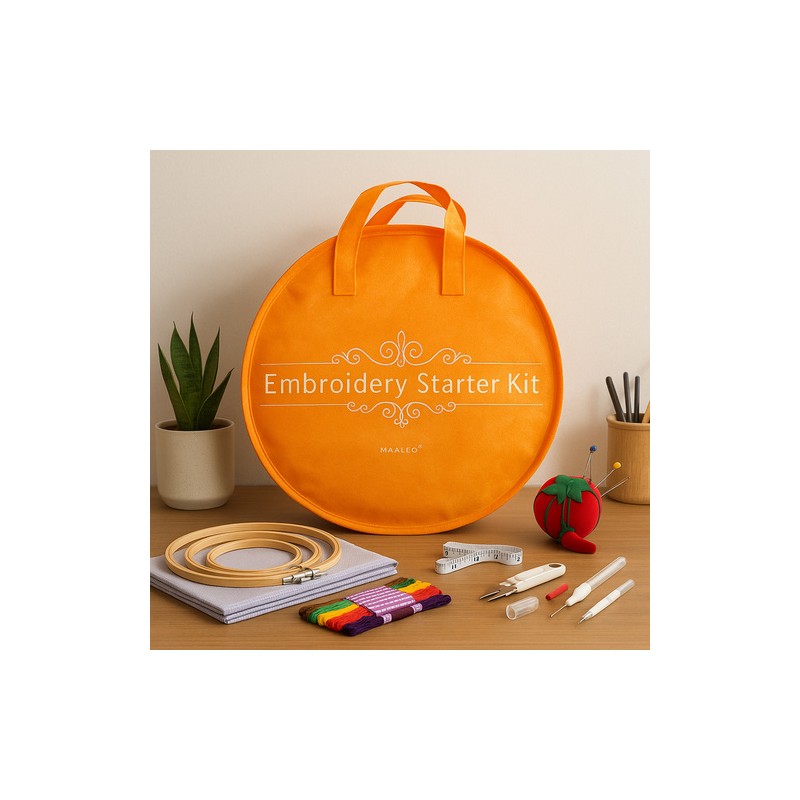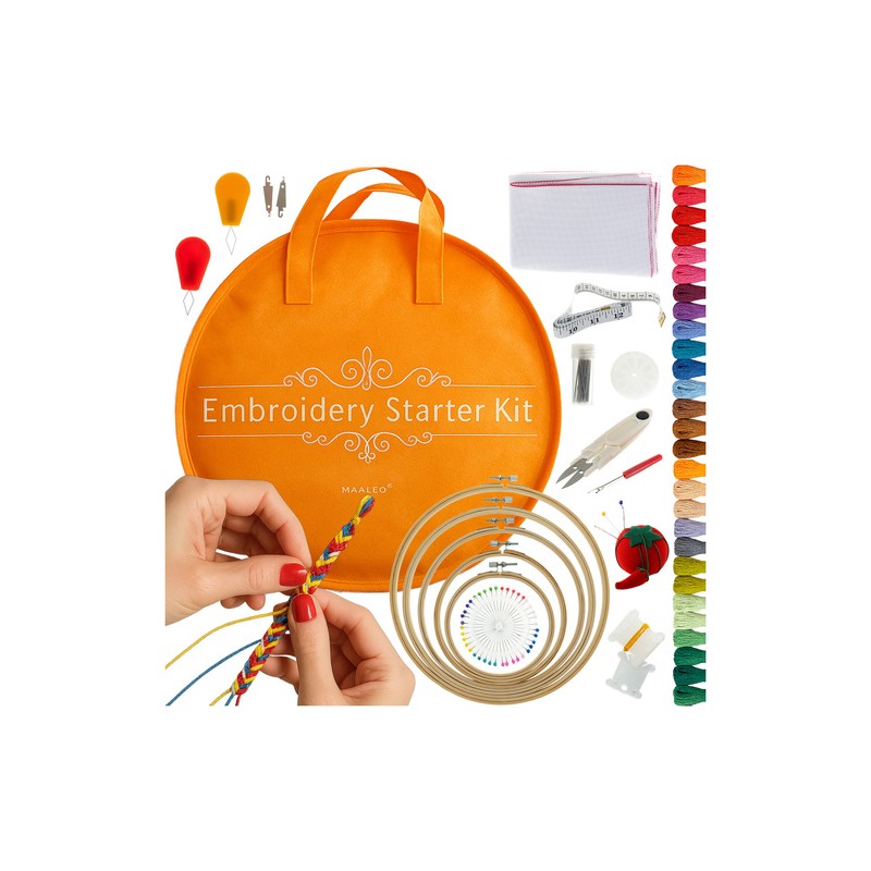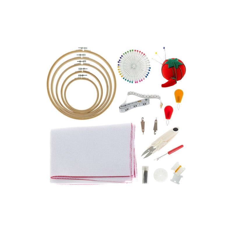 Tárolótáskát, bambusz hímzőrámákat, hímzőanyagot és többféle eszközt, kiegészítőt a kényelmes hímzéshez.