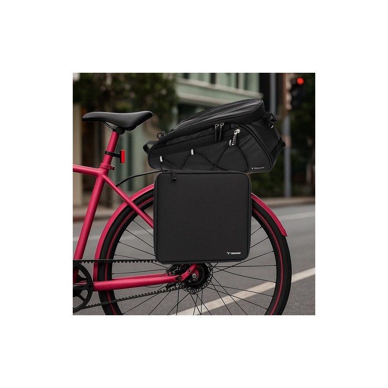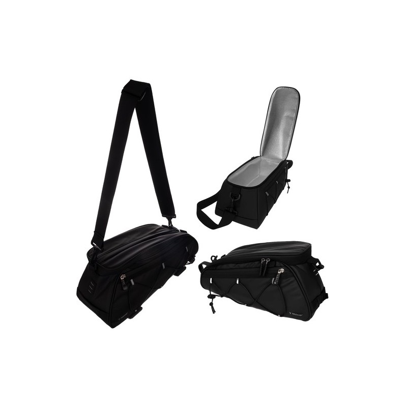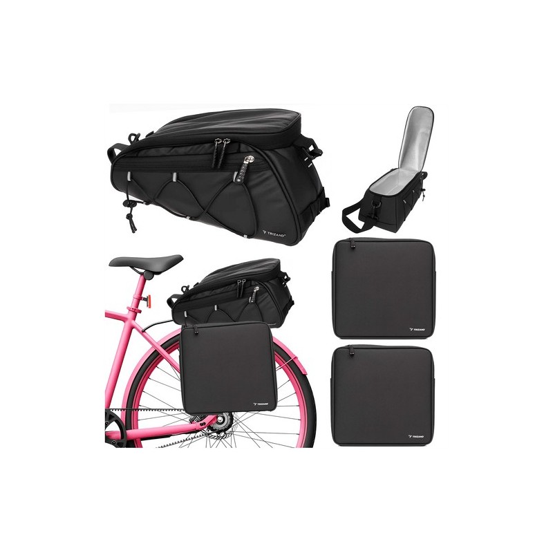 3 darabos, csomagtartóra rögzíthető vízálló kerékpáros táskaszett kb. 16 literes kapacitással, középen hőszigetelt táskával. Elfér benne ruha, étel és apróság, a fényvisszaverők javítják a láthatóságot, a középső táska pedig lecsatolható és vállon is hordható.