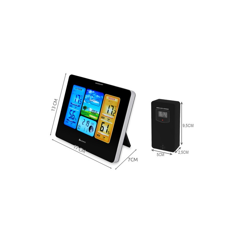 Méri és megjeleníti a hőmérsékletet és a páratartalmat beltéren és kültéren, valamint méri a légnyomást. Van holdfázis kijelzés, óra, dátum és időjárási trend kijelző is.