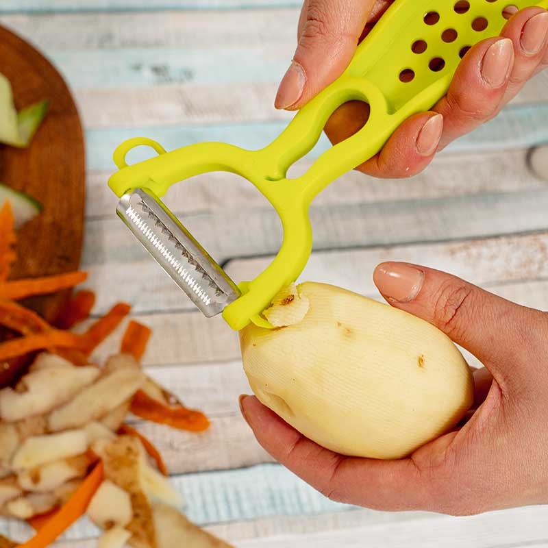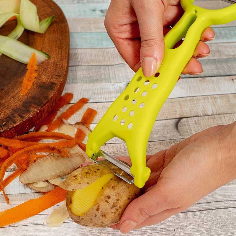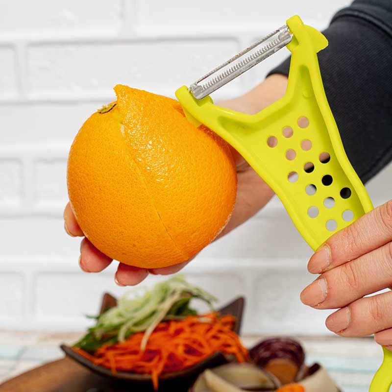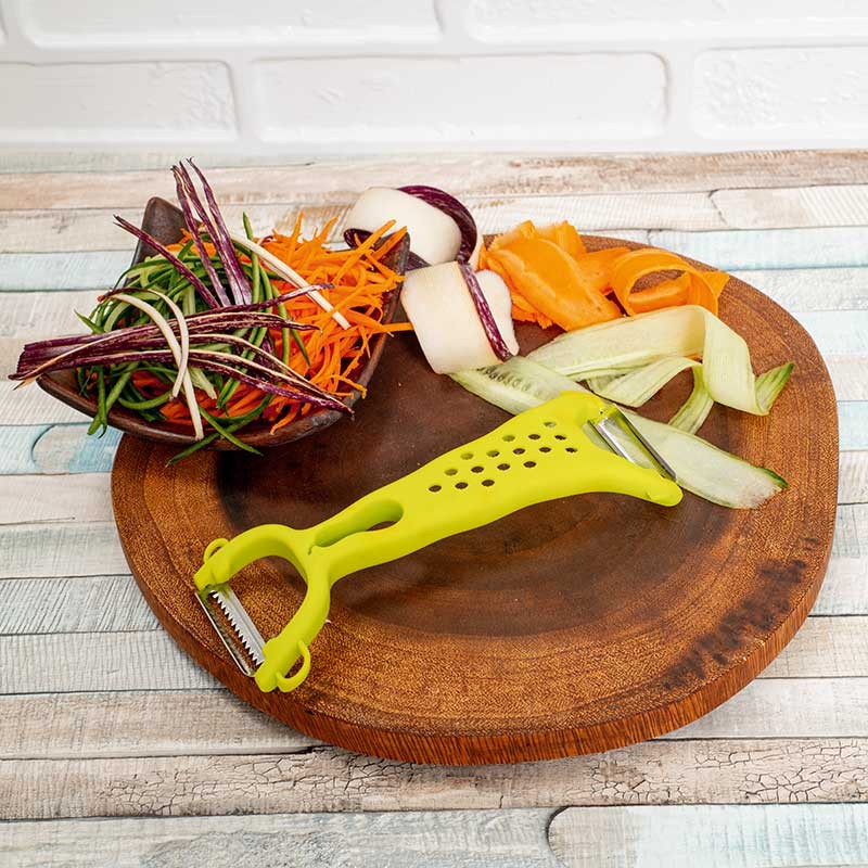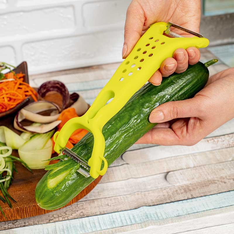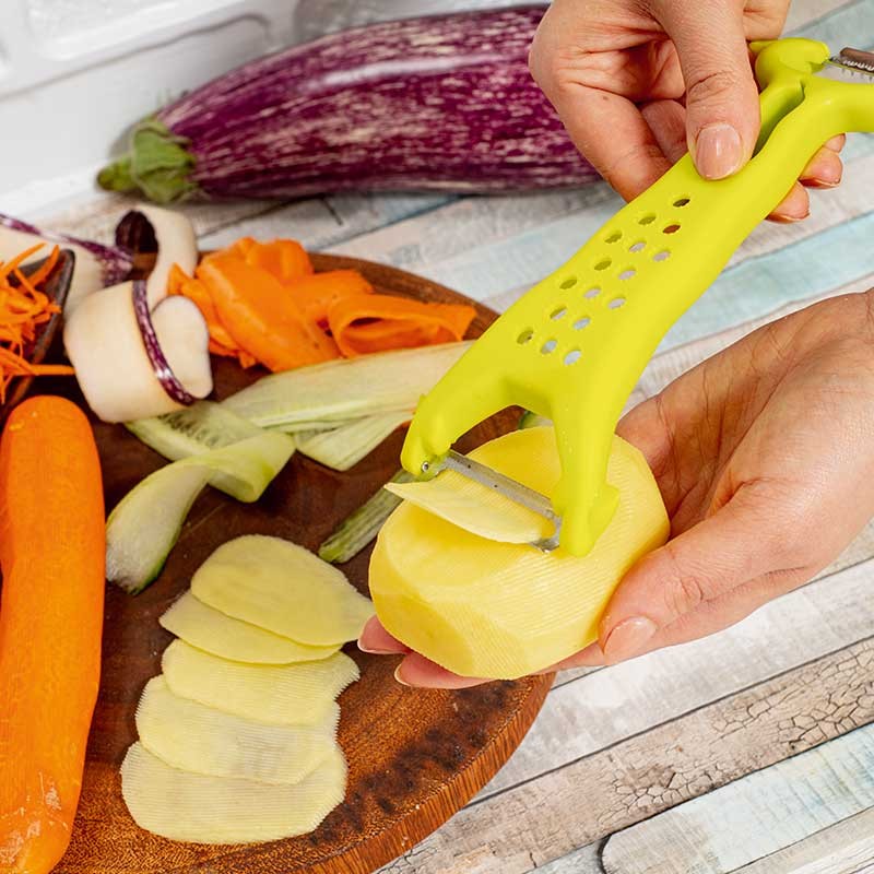 Rozsdamentes acél pengék különféle feladatokhoz: zöldségek hámozására, vékony szeletelek vágására és julienne csíkok készítésére.