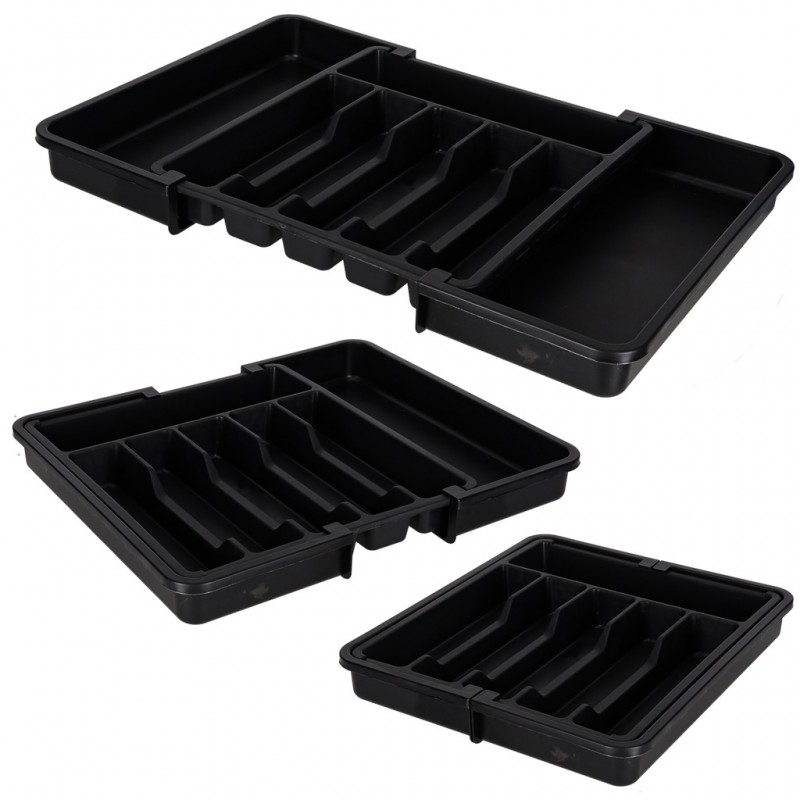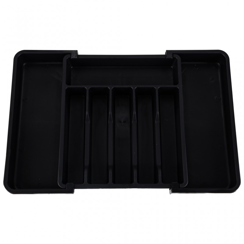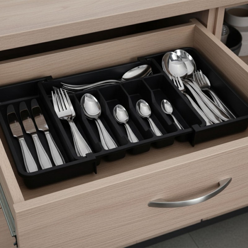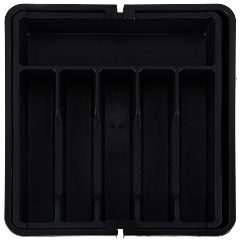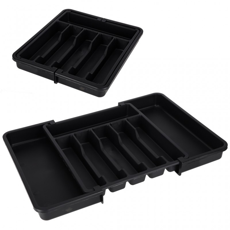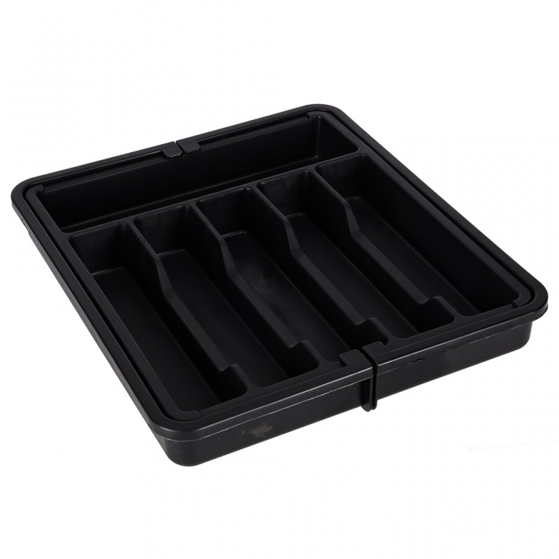 Kihúzható, szélességében állítható fiókrendező evőeszközökhöz, 8 rekesszel, minőségi műanyagból, amely védi a fiók belsejét, 33–56,5 cm-es szélességi tartományhoz.