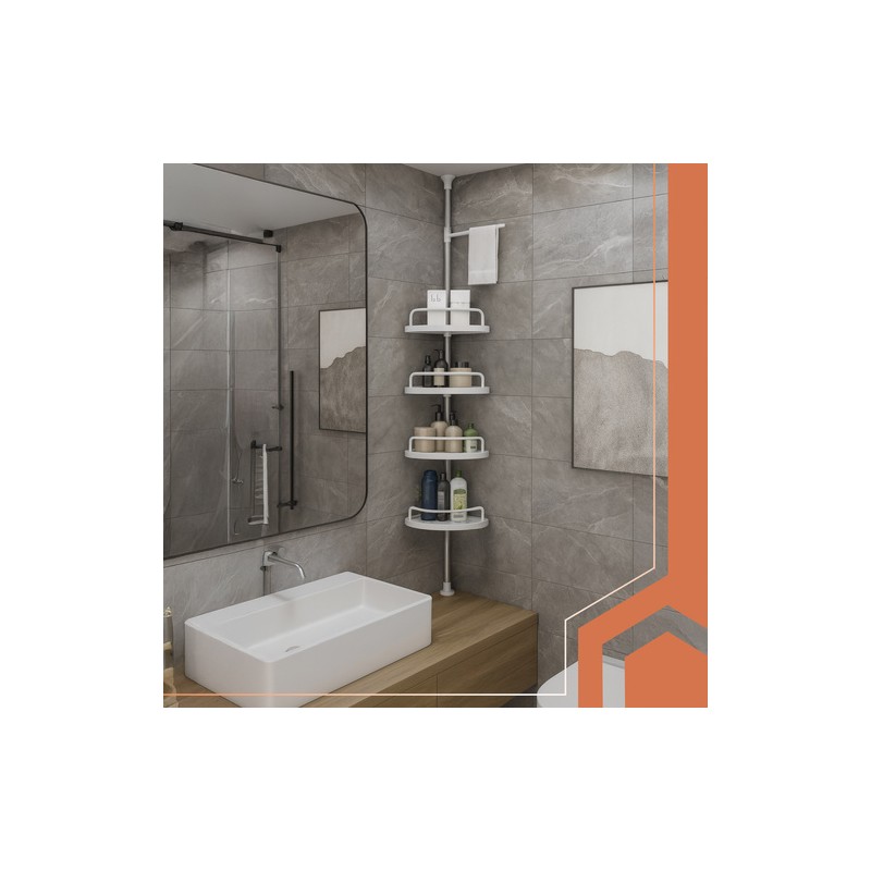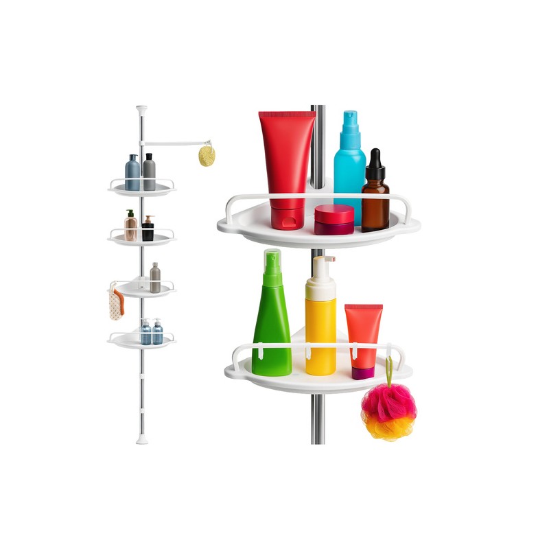 A sarokba állítható teleszkópos fürdőszobai polc segít rendet tartani a zuhanykabinban és az egész fürdőszobában. A körülbelül 240–310 cm között állítható magasság lehetővé teszi, hogy a rudat különböző belmagasságokhoz igazítsd, fúrás és nagyobb erőfeszítés nélkül. A négy polcszint, a törölközőtartó és a kiegészítő akasztók kényelmes tárolást biztosítanak a kozmetikumoknak, szivacsoknak, törölközőknek és egyéb fürdőkiegészítőknek, így minden kéznél van a zuhany alatt.