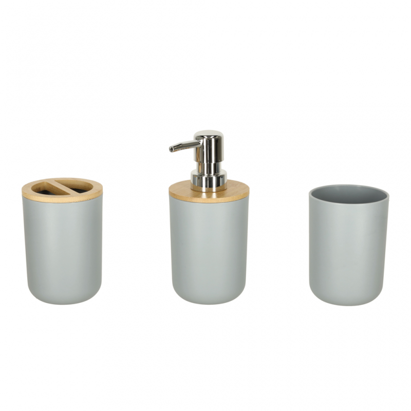 A szett 6 elemet tartalmaz: szappanadagolót, fogkefetartót, poharat, szappantartót, kefét és szemetest.