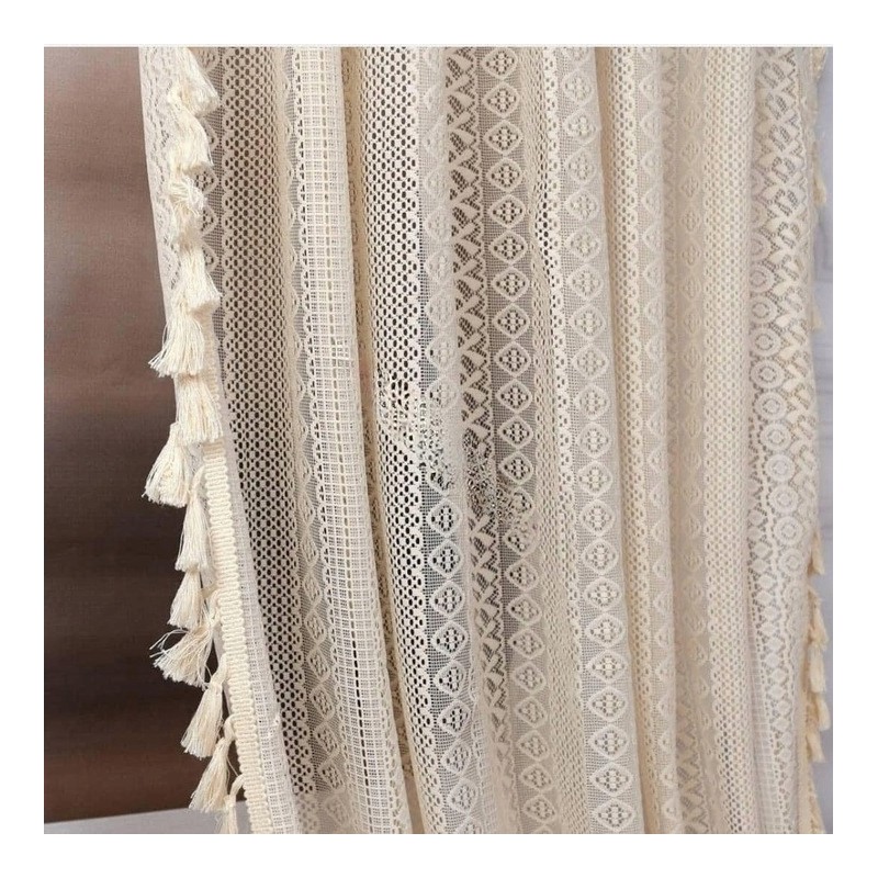 A függöny alapja kiváló minőségű, bojtokkal díszített zsakárd anyag, amely az eleganciát tartóssággal ötvözi. A poliészter csipke jól bírja a mindennapos használatot, ugyanakkor könnyen tisztítható, így a függöny hosszú ideig megőrzi mutatós megjelenését. A gondos kivitel és a részletek erősítik a BOHO stílus karakterét.