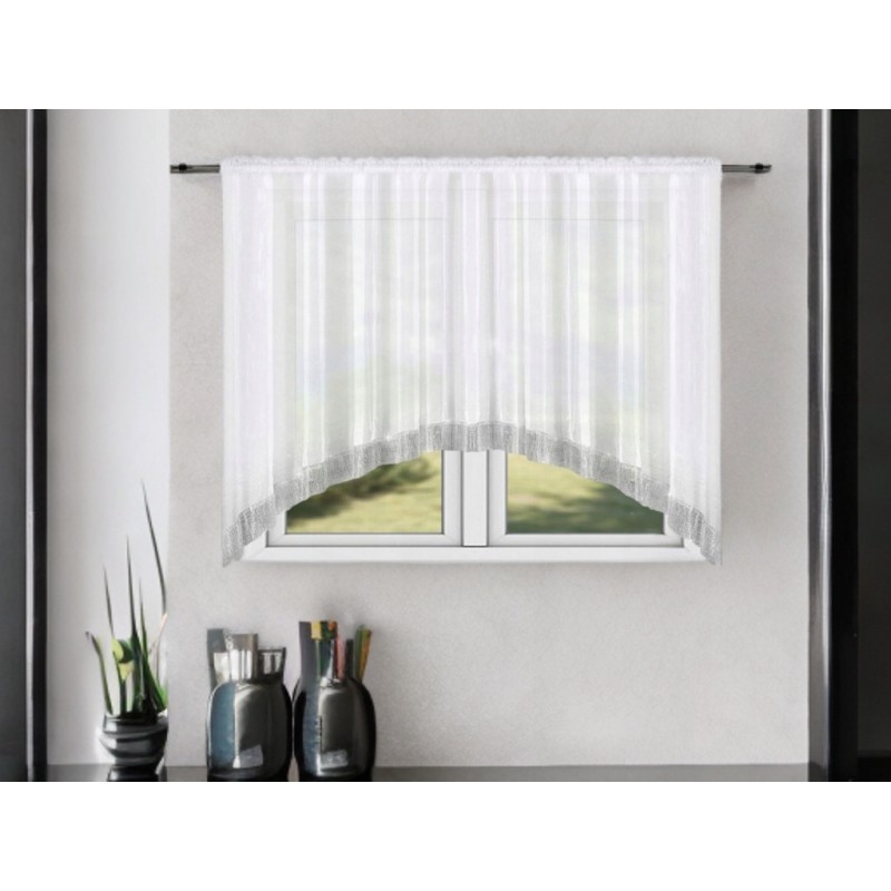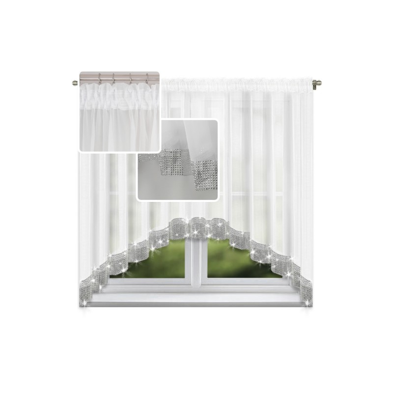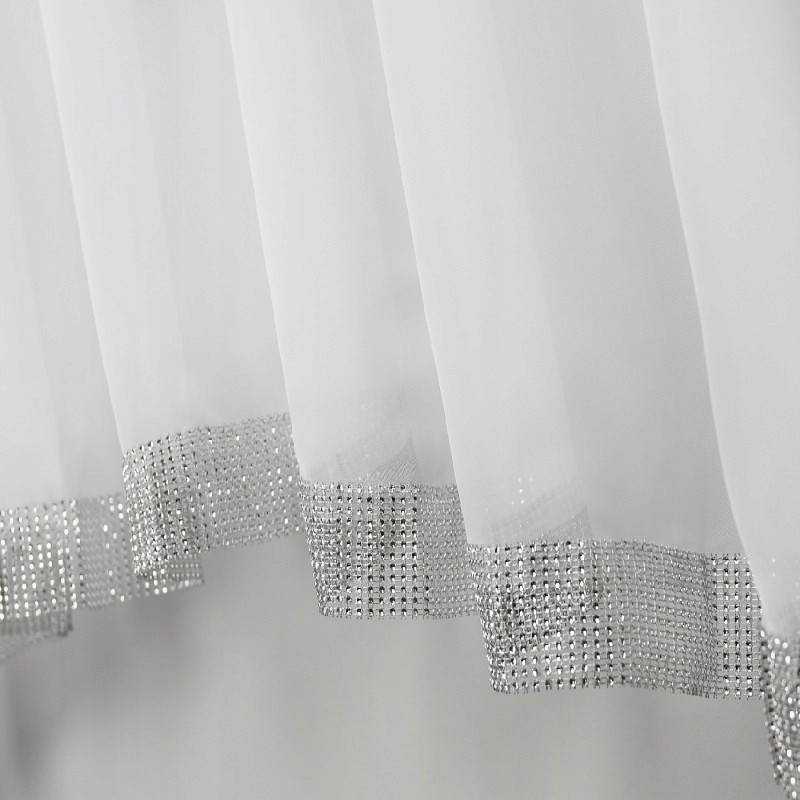 Fehér, voál anyagú glamour függöny finom ezüst strasszokkal az alsó szegélyen, 400 x 150 cm-es méretben, ráncolószalaggal és többféle rögzítési lehetőséggel, tartós 100% poliészterből, könnyen kezelhető.