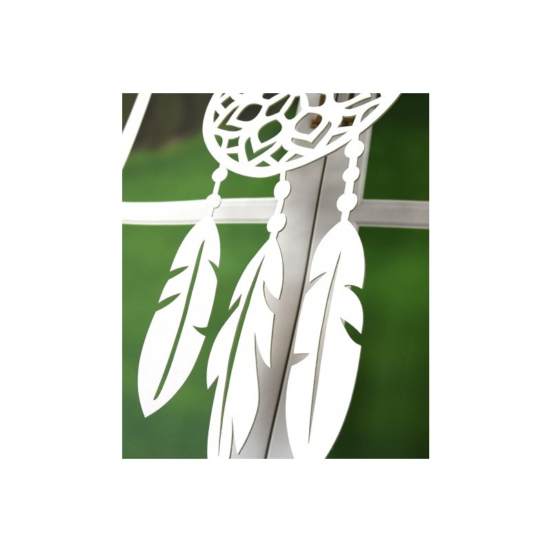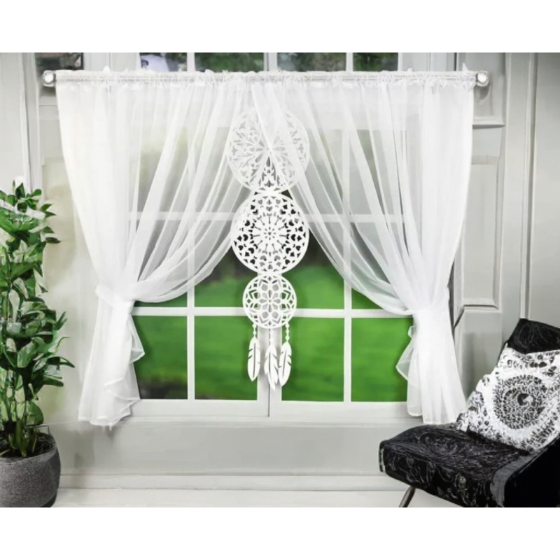 Elegáns szett: fehér voile függöny 400x150 cm méretben és dekorpanel álomfogó motívummal, könnyen felszerelhető rúdkarnisra, csipeszre vagy akasztóra.
