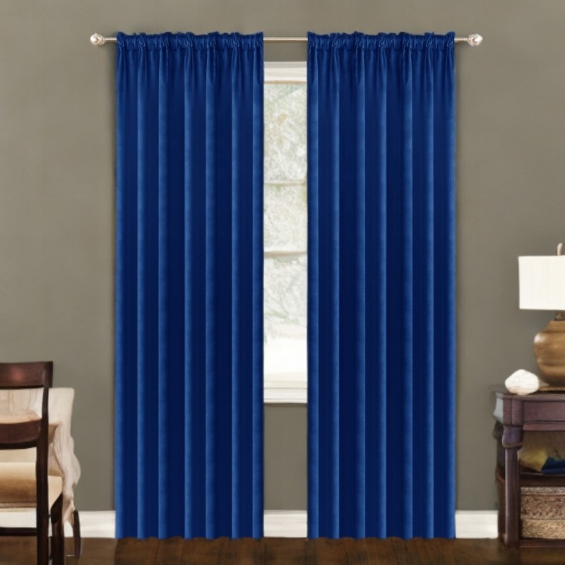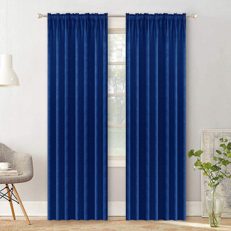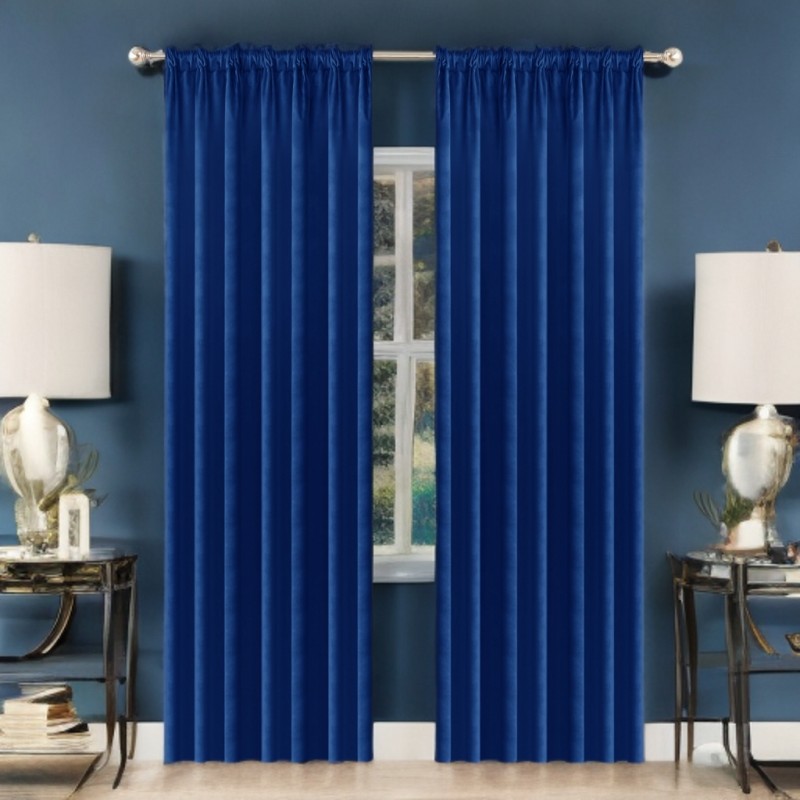 Sötétkék, sötétítő velúr függöny glamour stílusban, 140 x 230 cm-es méretben, ráncolós szalaggal, amely elegáns ablakdekorációt, fényvédelemet és nagyobb intimitást biztosít.