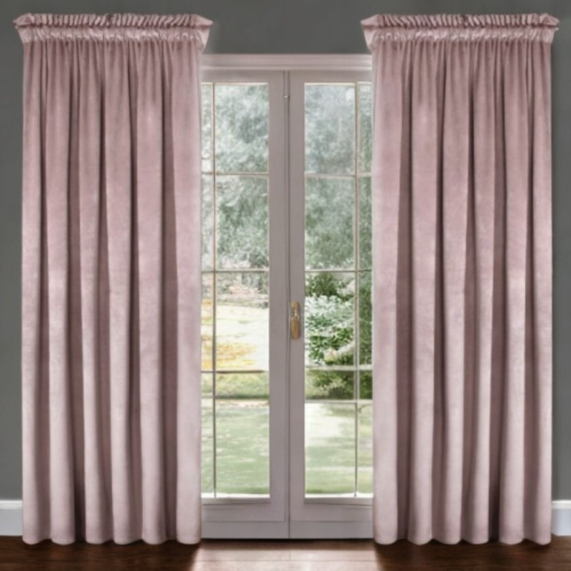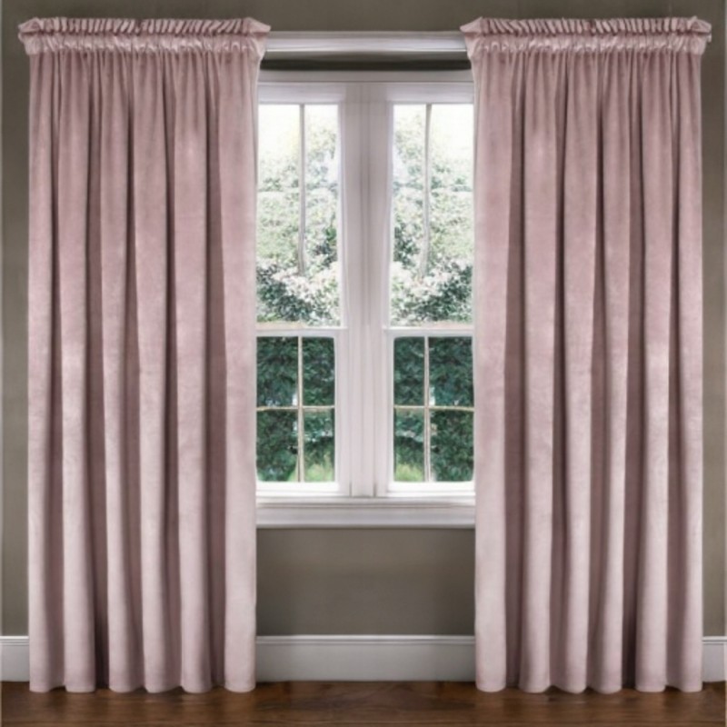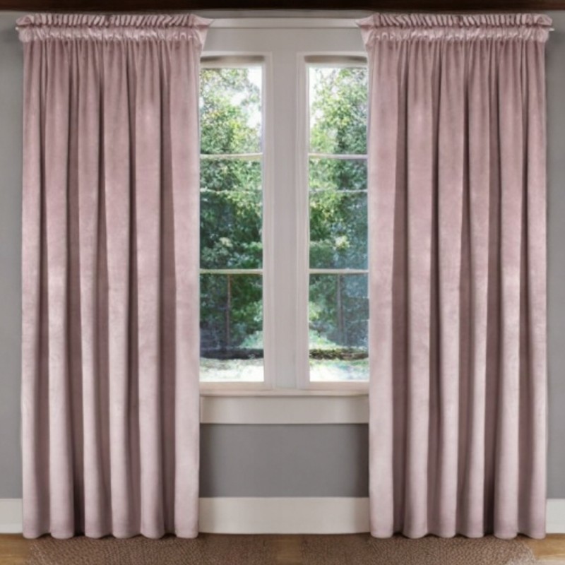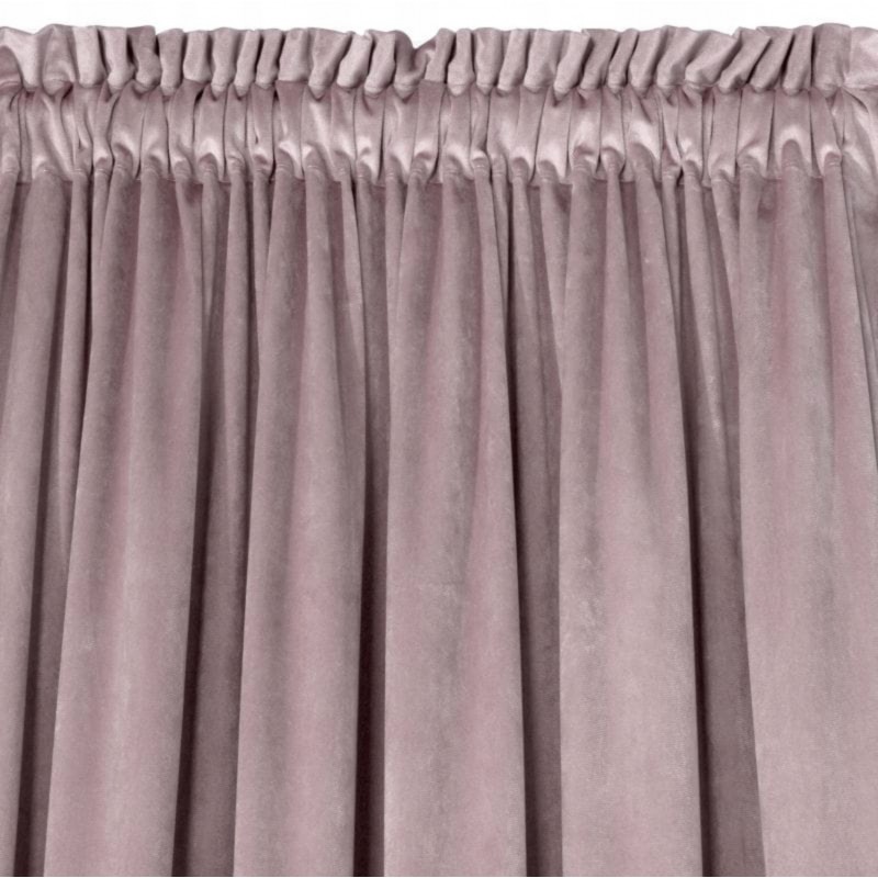 Púderrózsaszín, sötétítő velúr függöny glamour stílusban, 140 x 230 cm-es méretben, ráncolós szalaggal, amely elegáns ablakdekorációt, fényvédelmet és nagyobb intimitást biztosít.