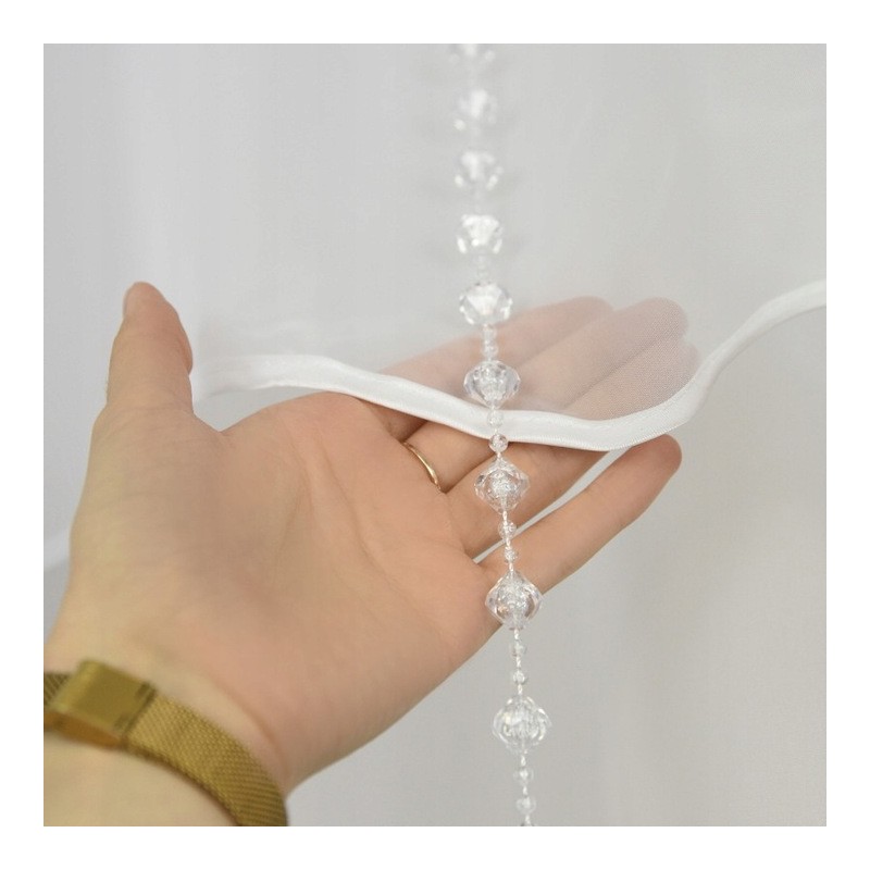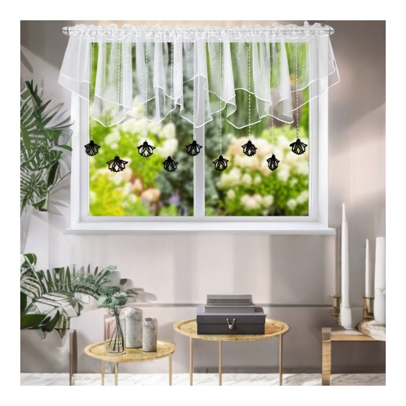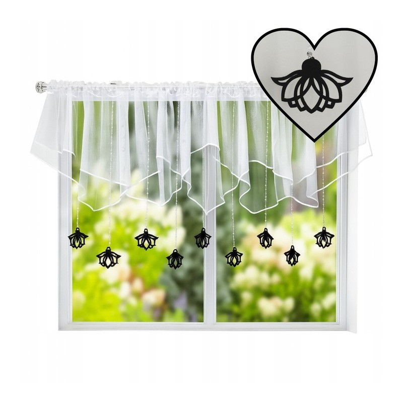 Rövid, dekoratív hófehér voile függöny fekete filc függesztő díszekkel. Finoman takar, beengedi a természetes fényt, és könnyedséget visz a térbe. A gyártási folyamat miatt a szállítási idő hosszabb.
