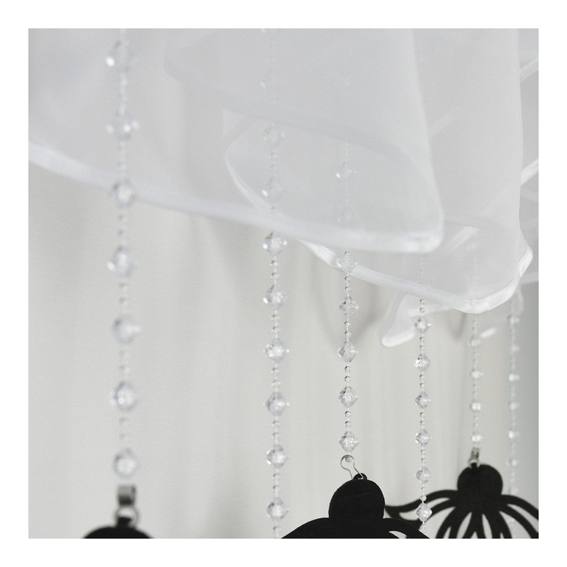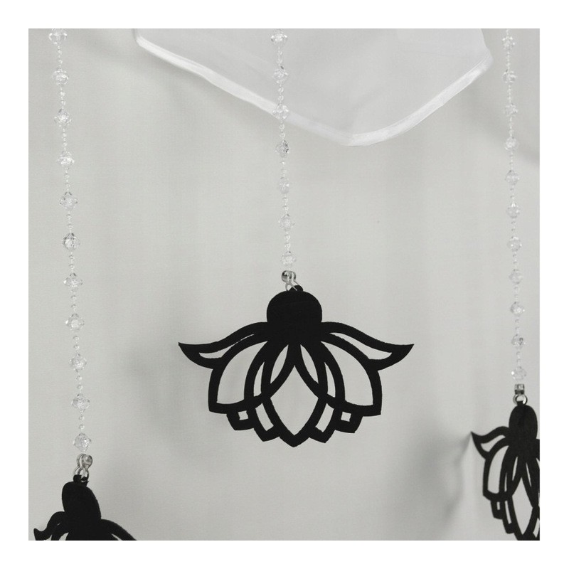 A hófehér szín és a könnyed, áttetsző megjelenés sokféle enteriőrbe illeszkedik, és finoman ötvözi a klasszikus eleganciát egy modern dekoratív részlettel. A fekete filc díszfüggesztők diszkréten vonzzák a tekintetet, miközben a tér összképe levegősebbé válik.