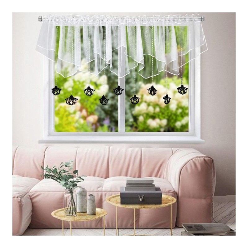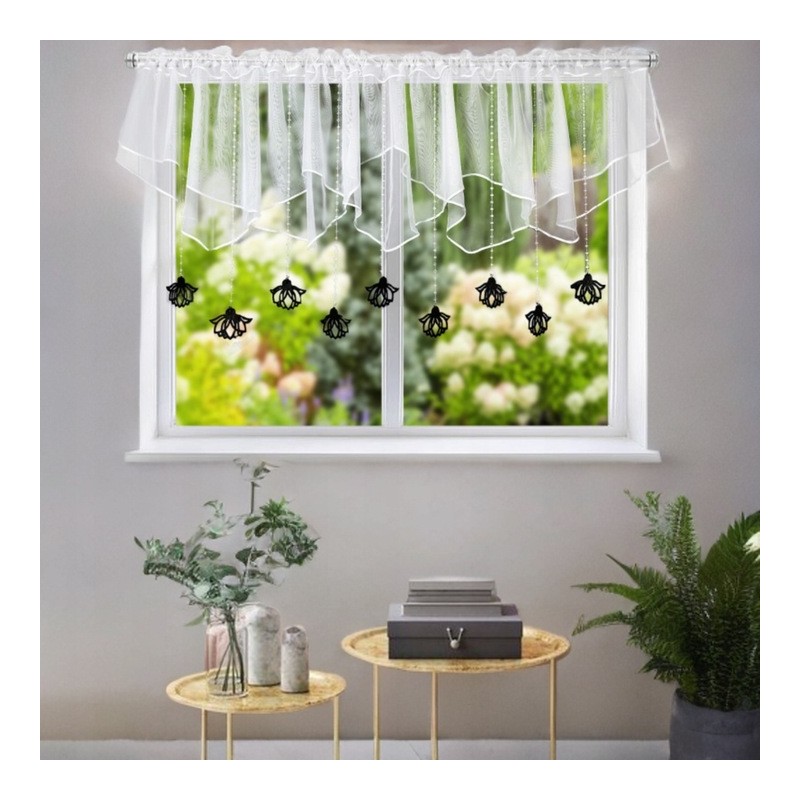A hófehér voile és a fekete filc díszfüggesztők együtt finom, mégis feltűnő ablakdekorációt teremtenek.