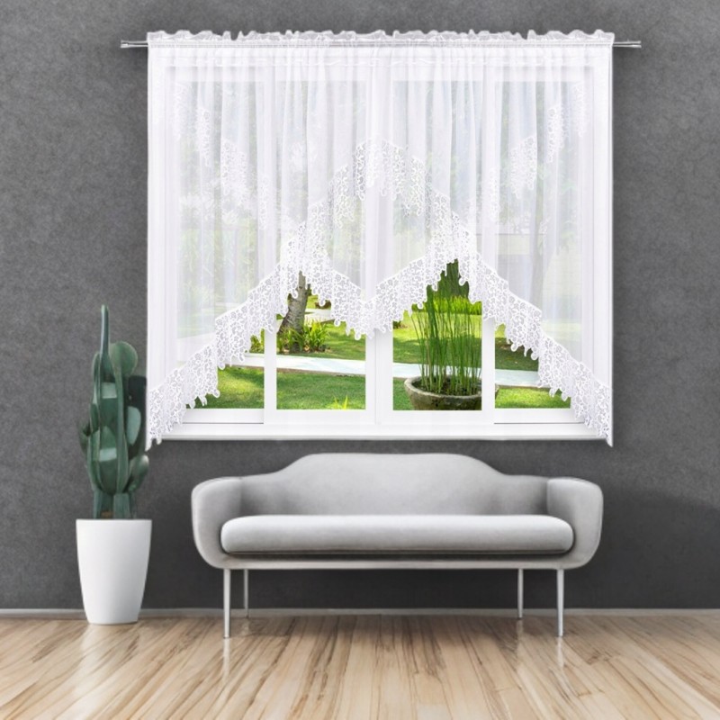 Ha klasszikus eleganciát szeretnél modern, látványos megjelenéssel, ez a függöny telitalálat. A kétrétegű kialakítás mélységet és dúsabb hatást ad az ablaknak, miközben a felső réteg finom, fehér voile anyaga kellemesen szórja a fényt. A széles, díszes gipűr karakteres részlet, amely kiemeli az ablakdekorációt, a fehér szín pedig könnyen harmonizál a különböző stílusokkal. A gyártási folyamat miatt a szállítási idő hosszabb.