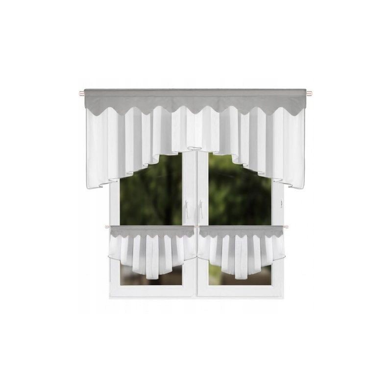 Elegáns konyhai szett: voile függöny 200x80 cm és vitrázs függönyök 90x50 cm, szürke szegéllyel. Meleg, otthonos hangulatot ad, finoman szűri a fényt és segít megőrizni a privát szférát, miközben a minta karaktert ad az ablaknak. A gyártási folyamat miatt a szállítási idő hosszabb.