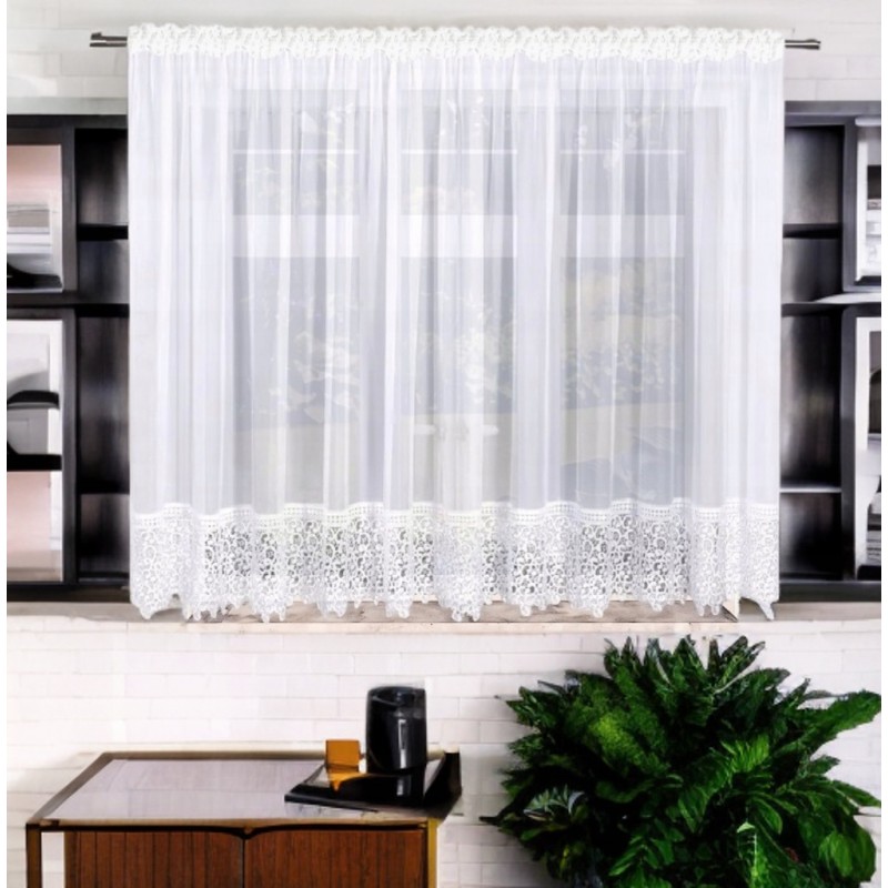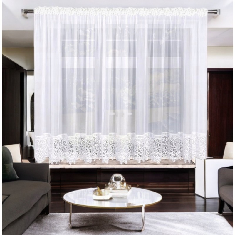 Modern, fehér voile függöny látványos, 30 cm-es csipkével és finoman csillogó szállal. Szépen szórja a fényt, világos és otthonos hangulatot teremt, miközben eleganciát és presztízst ad a térnek. A gyártási folyamat miatt a szállítási idő hosszabb.