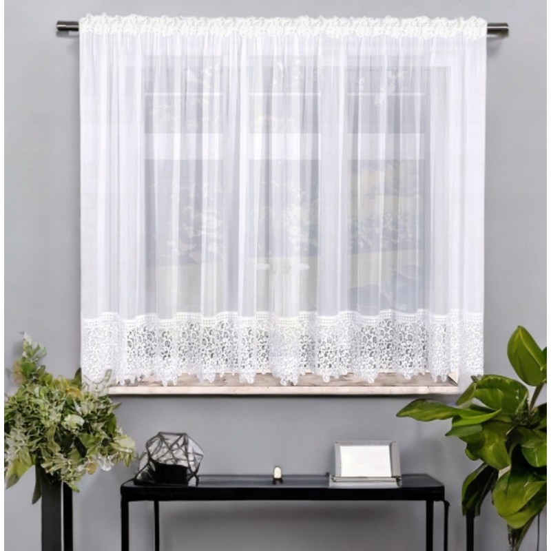 Az anyag könnyű fehér voile, kiegészítve 30 cm-es csipkével, finoman csillogó szállal. Összetétel: 100% poliészter, amely ellenáll az alakváltozásnak és a fakulásnak. A bevarrt ráncolószalag alagúttal egyszerű felhelyezést biztosít, és látványos elrendezést tesz lehetővé. Az oldalak felhajtással készültek a rendezett, sima szegélyért.