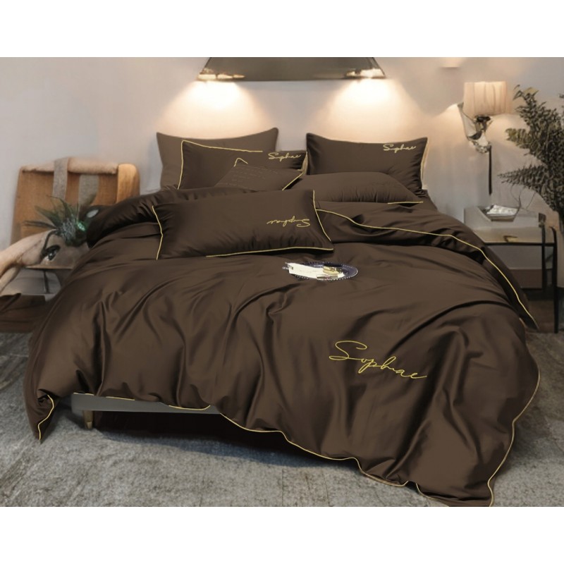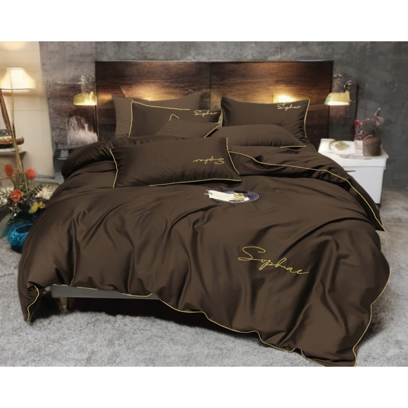 A csokoládé árnyalat és az arany szegély együtt kifinomult, luxus hangulatot teremt. A hímzett felirat visszafogott, mégis karakteres részlet, amely különlegessé teszi az ágynemű összképét.