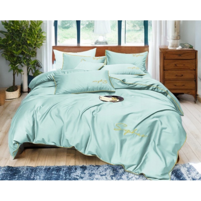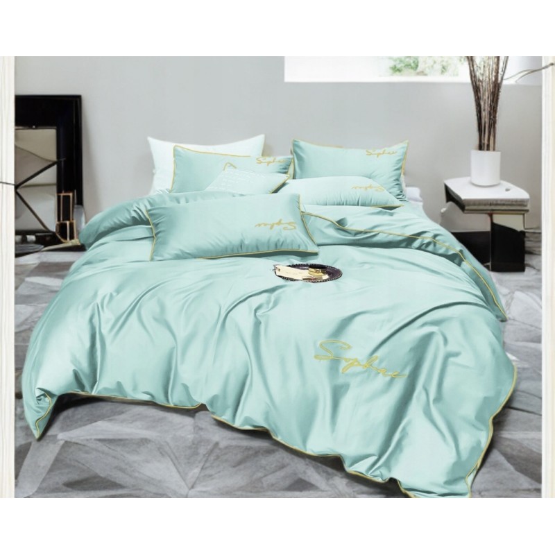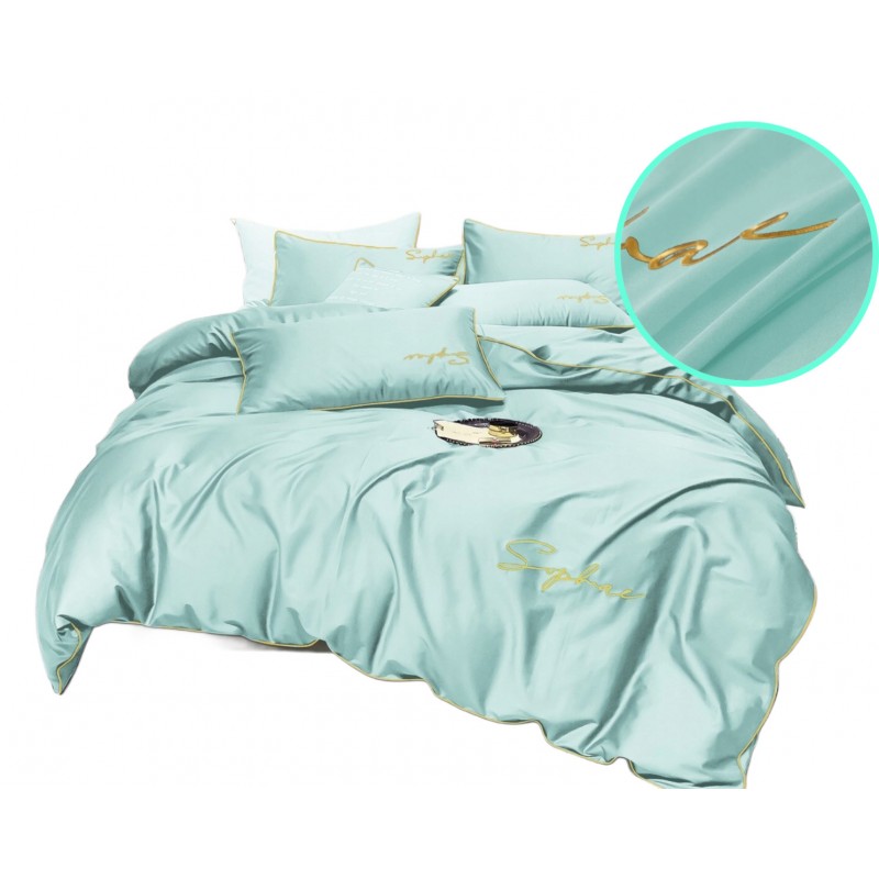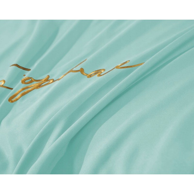 A mentazöld árnyalat és az arany szegély együtt friss, elegáns hangulatot teremt. A hímzett felirat visszafogott, mégis karakteres részlet, amely különlegessé teszi az ágynemű összképét.