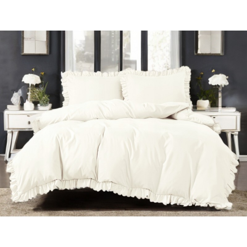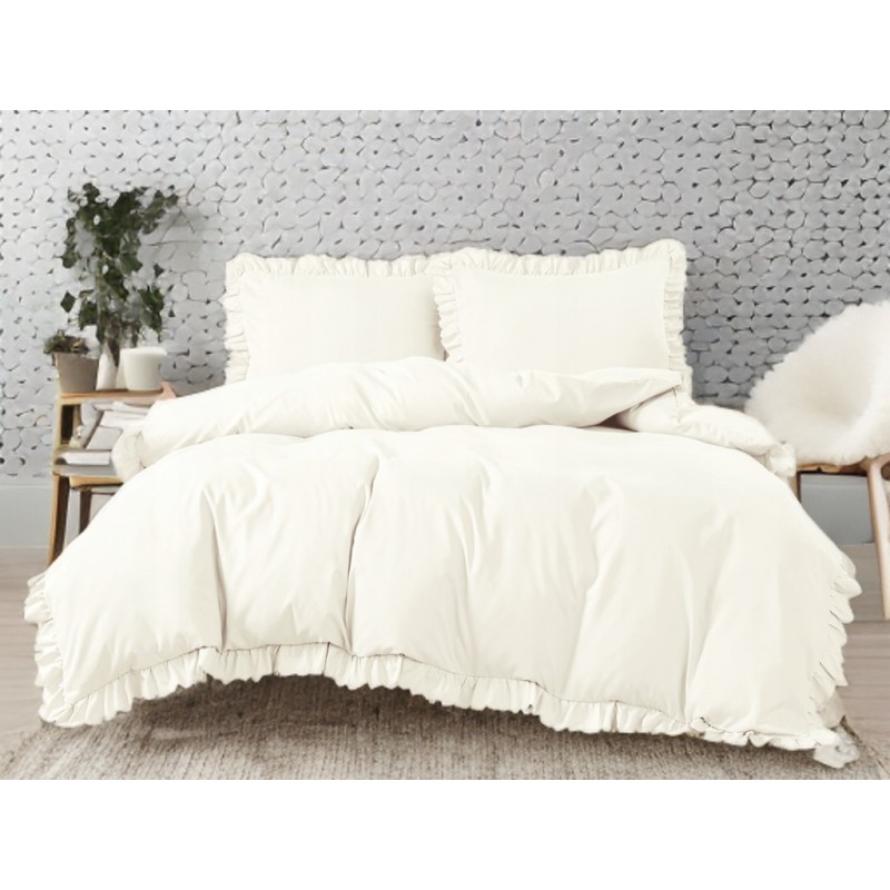 A krémszín a fodrokkal együtt világos, letisztult hatást kelt, és finom, dekoratív részlettel teszi elegánsabbá az ágy összképét.