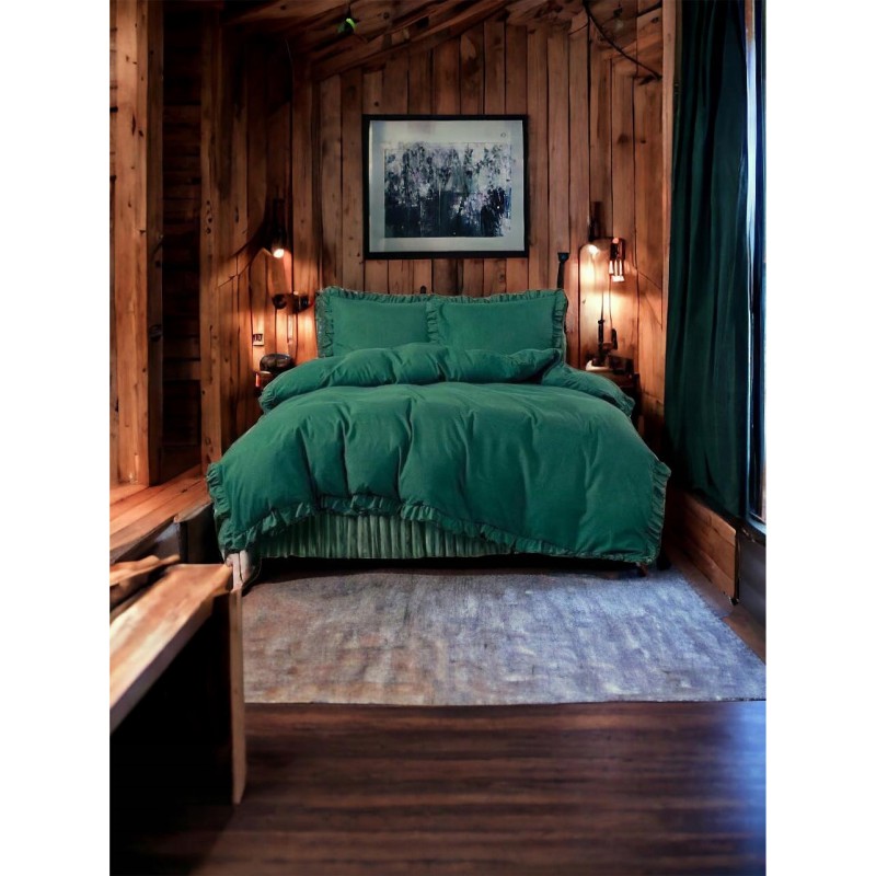 A zöld szín a fodrokkal együtt kellemes, dekoratív hatást kelt, és hangsúlyosabbá teszi az ágynemű megjelenését.