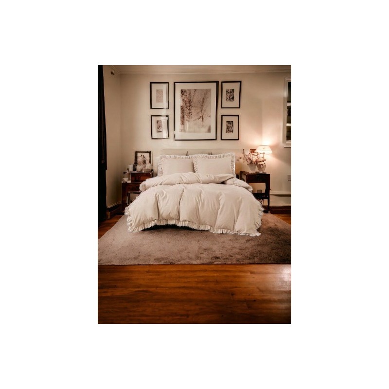 A bézs szín a fodros szegéllyel együtt nyugodt, elegáns hangulatot teremt, és kiemeli a szett dekoratív jellegét.