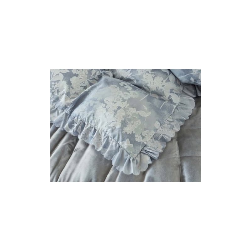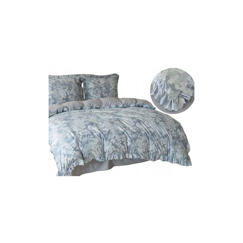 A fodros szegély és a szürke-kék virágminta együtt látványos, igényes megjelenést ad az ágyneműnek.