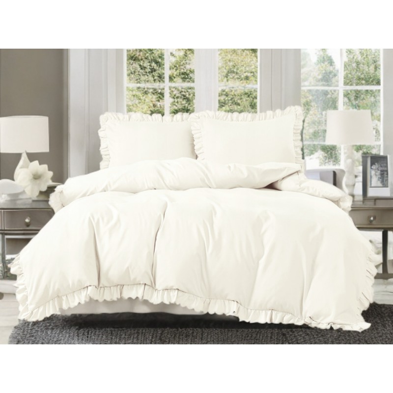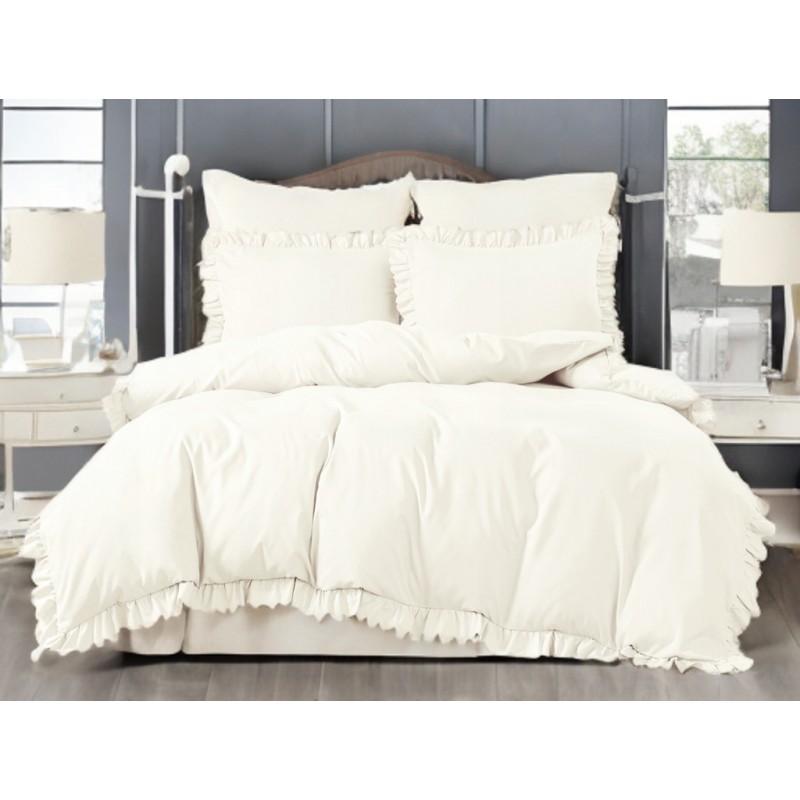 A krémszín a fodrokkal együtt világos, letisztult hatást kelt, és finom, dekoratív részlettel teszi elegánsabbá az ágy összképét.