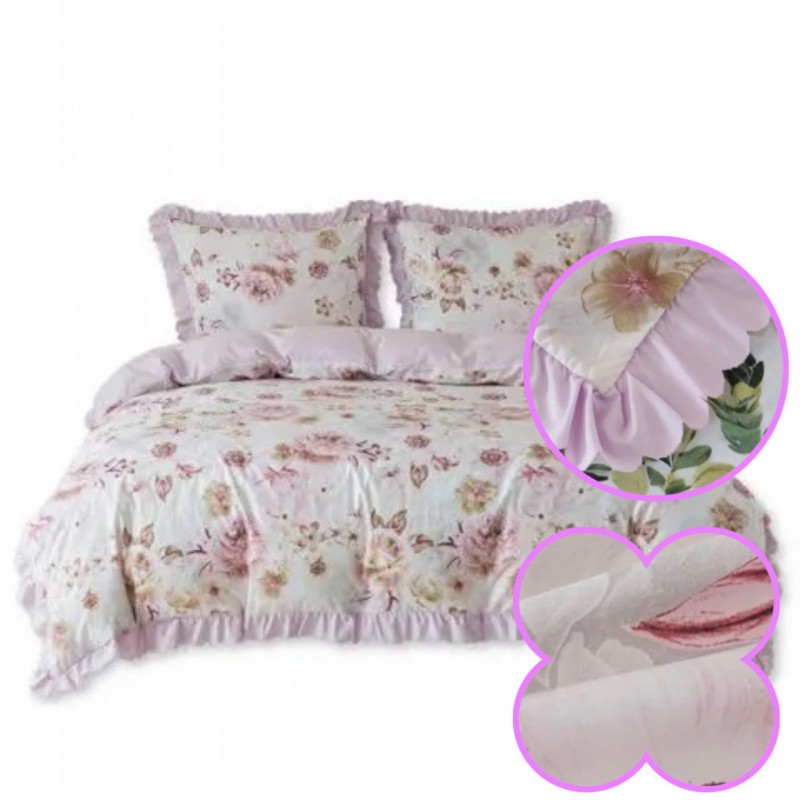 A fodros szegély és a rózsaszín virágminta együtt látványos, igényes megjelenést ad az ágyneműnek.