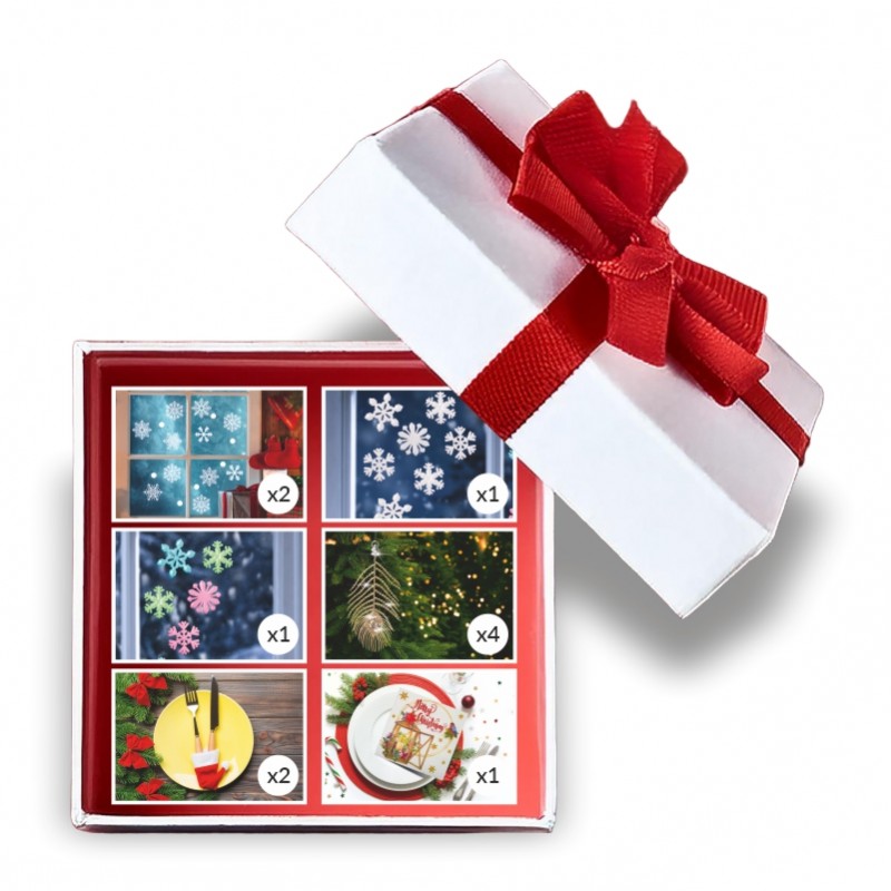 A "Karácsonyi hangulat" dekorációs box olyan díszeket tartalmaz, amelyek azonnal ünnepi légkört teremtenek otthonodban. Egy csomagban találsz asztali kiegészítőket, apró dekorációkat és klasszikus karácsonyi motívumokat, így könnyen összeállíthatsz egy egységes ünnepi dekort.